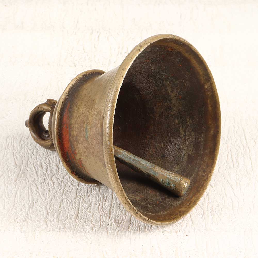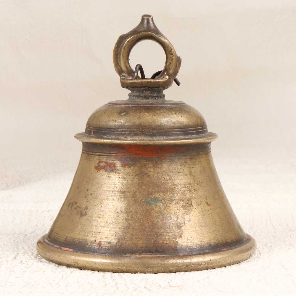Vintage bell metal construction with a loop at the top for hanging
