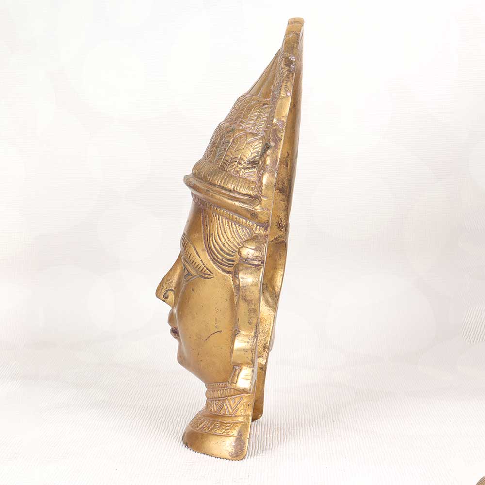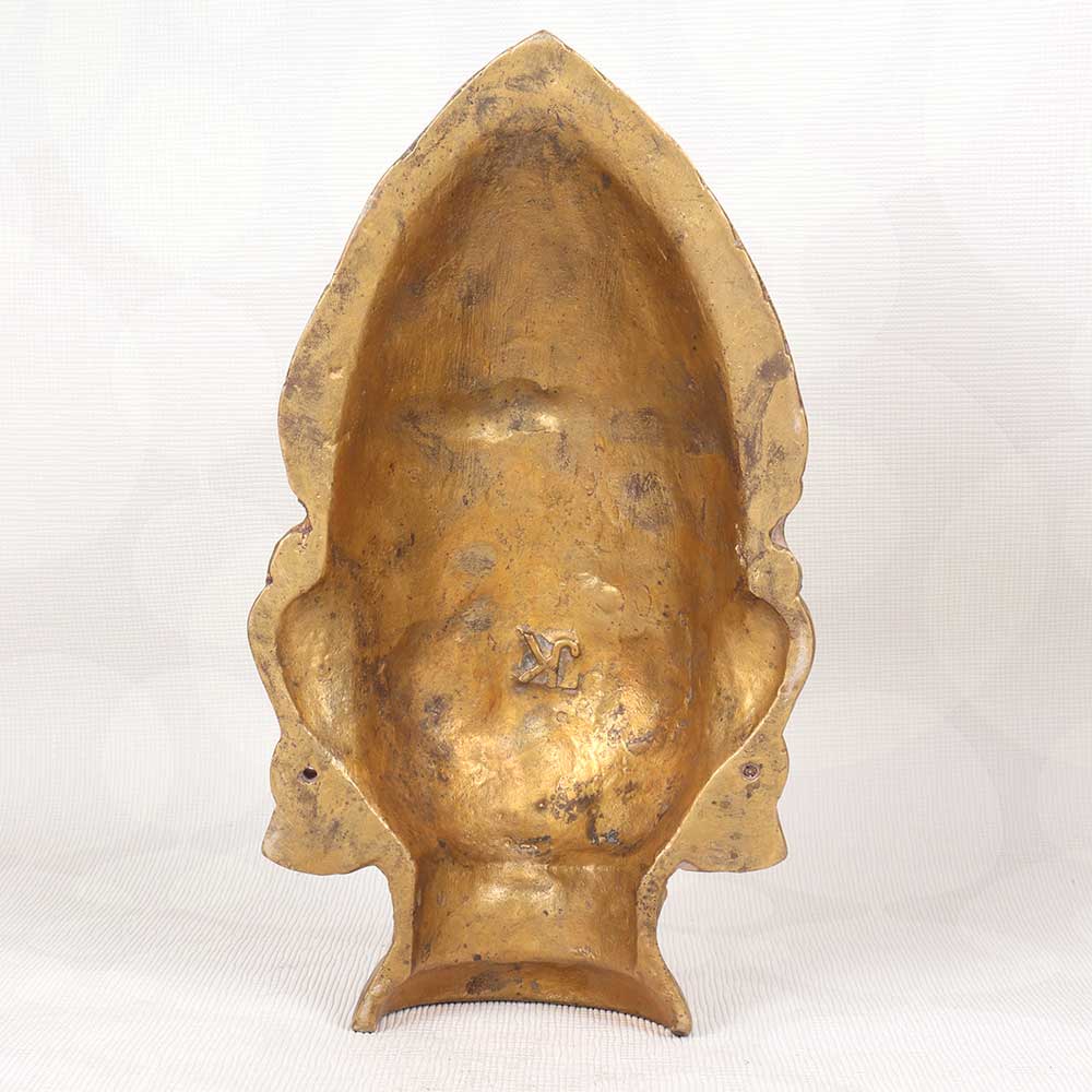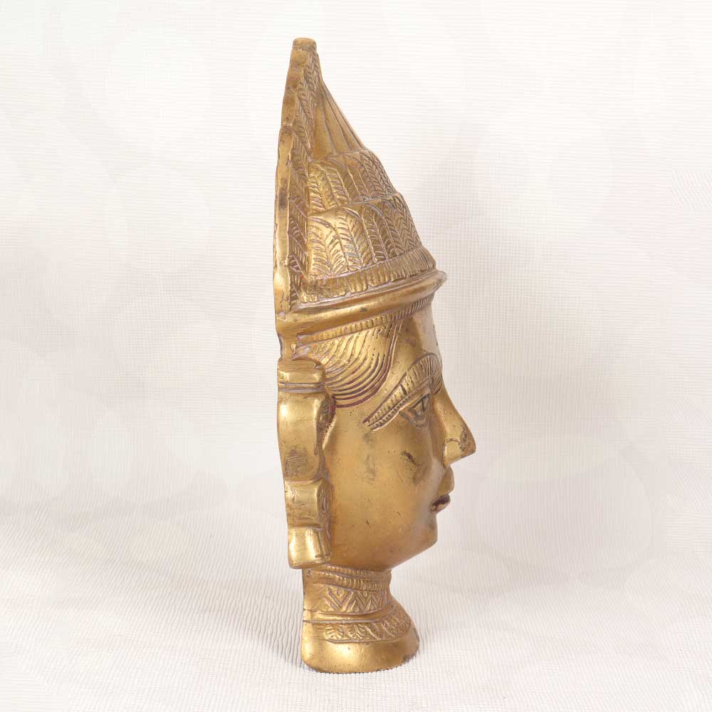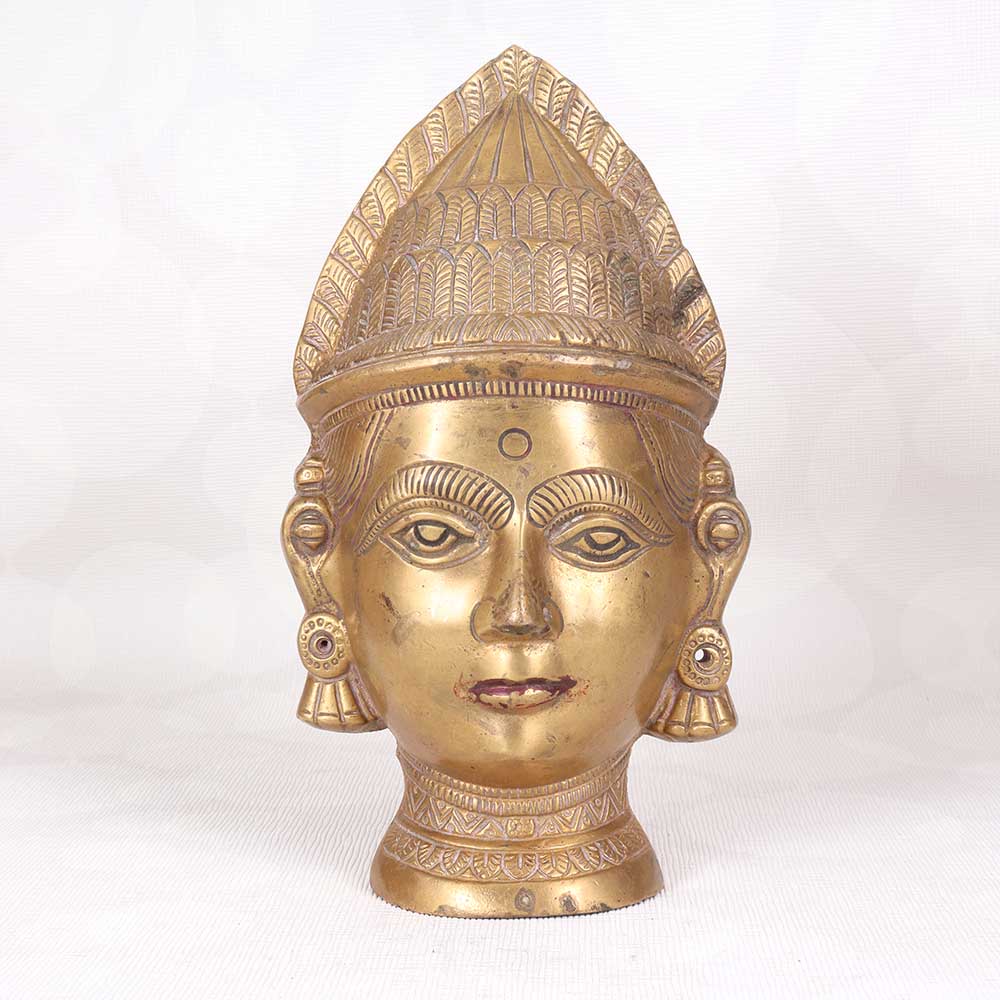 Bring a touch of antiquity into your home with this breathtaking brass Gauri head statue, crafted with care in Western India. This stunning vintage sculpture features the serene face of Gauri, the Hindu goddess of purity and devotion. Her elegant features and sublime expression are beautifully rendered in solid brass, polished to a warm, lustrous finish. Appreciate the fine details of this divine work of art. Adorned with intricate jewelry and traditional headwear, the goddess's face emanates tranquility and grace. Display her on a shelf, tabletop or niche to uplift any room with her peaceful presence. Her timeless beauty and cultural allure will fascinate guests and add a sophisticated accent to your decor. For collectors and admirers of Hindu iconography, this vintage Gauri head statue is a must-have. Let her bring her divine light into your home and remind you to nurture your own inner peace and purity. She makes a meaningful gift for yoga enthusiasts and anyone drawn to Indian spiritual motifs.