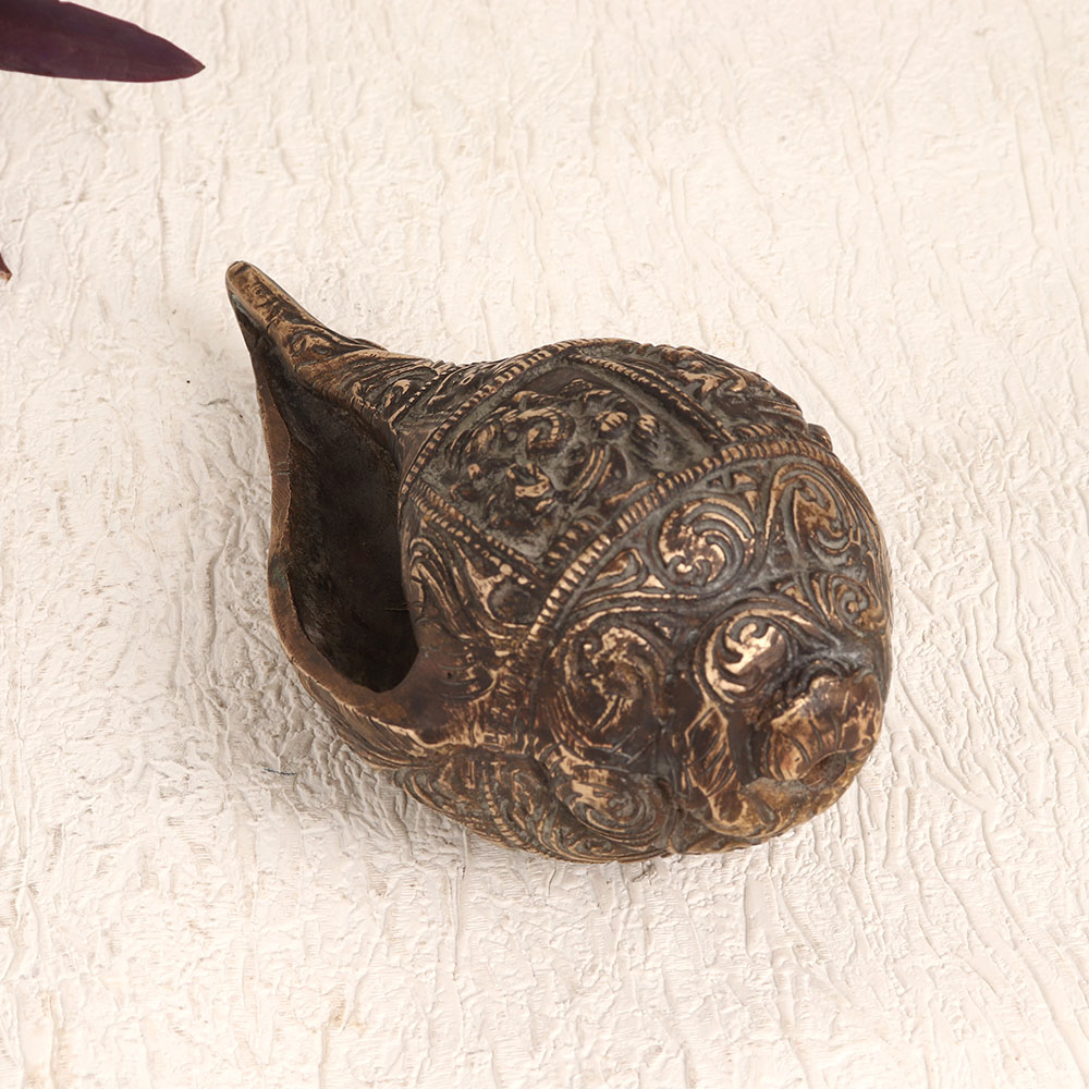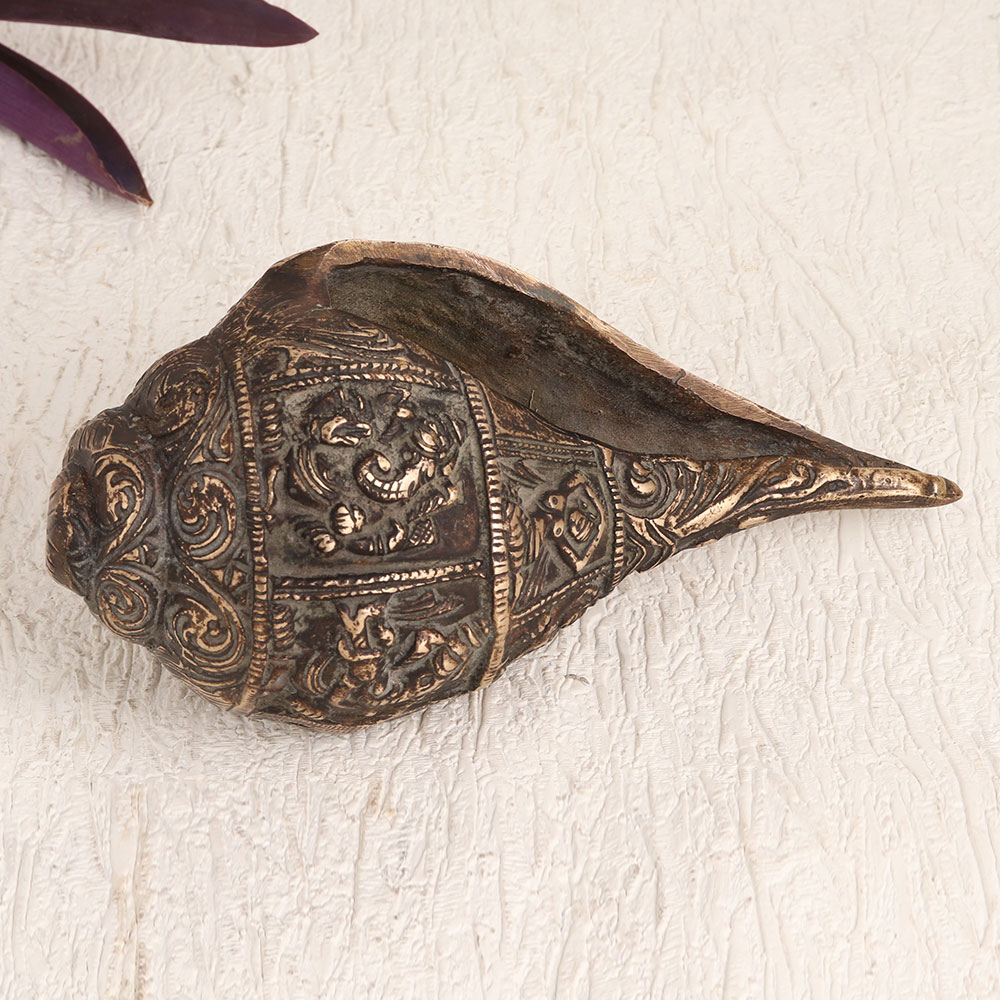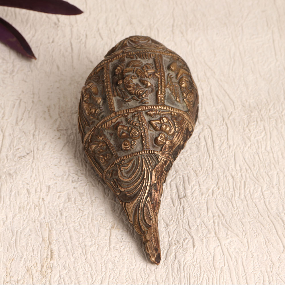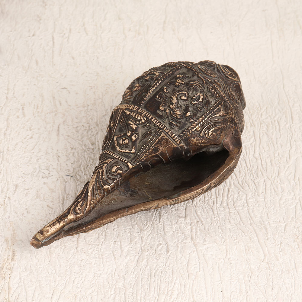 A brass shell or Shankh which is meticulously crafted by highly talented Indian artisans in the heart of the Himalayas. This timeless piece is adorned with intricate engravings of numerous god figures that captures the essence of centuries-old craftsmanship, making it a remarkable addition to your home, office, hotel, cafe, shop, or restaurant's prayer room. Handmade with precision and care, this masterpiece is crafted from high-quality brass, culminating in an antique brown finish that exudes a sense of antiquity and elegance. Beyond its spiritual significance, this Shankh serves as a symbol of exquisite decor, harmonizing seamlessly with any setting. Whether it graces your prayer altar or acts as a captivating accent in your vintage collection, its versatility knows no bounds. Gifting this Shankh on special, festive, or auspicious occasions is a gesture of profound thoughtfulness, infusing blessings and artistry into the lives of your loved ones.