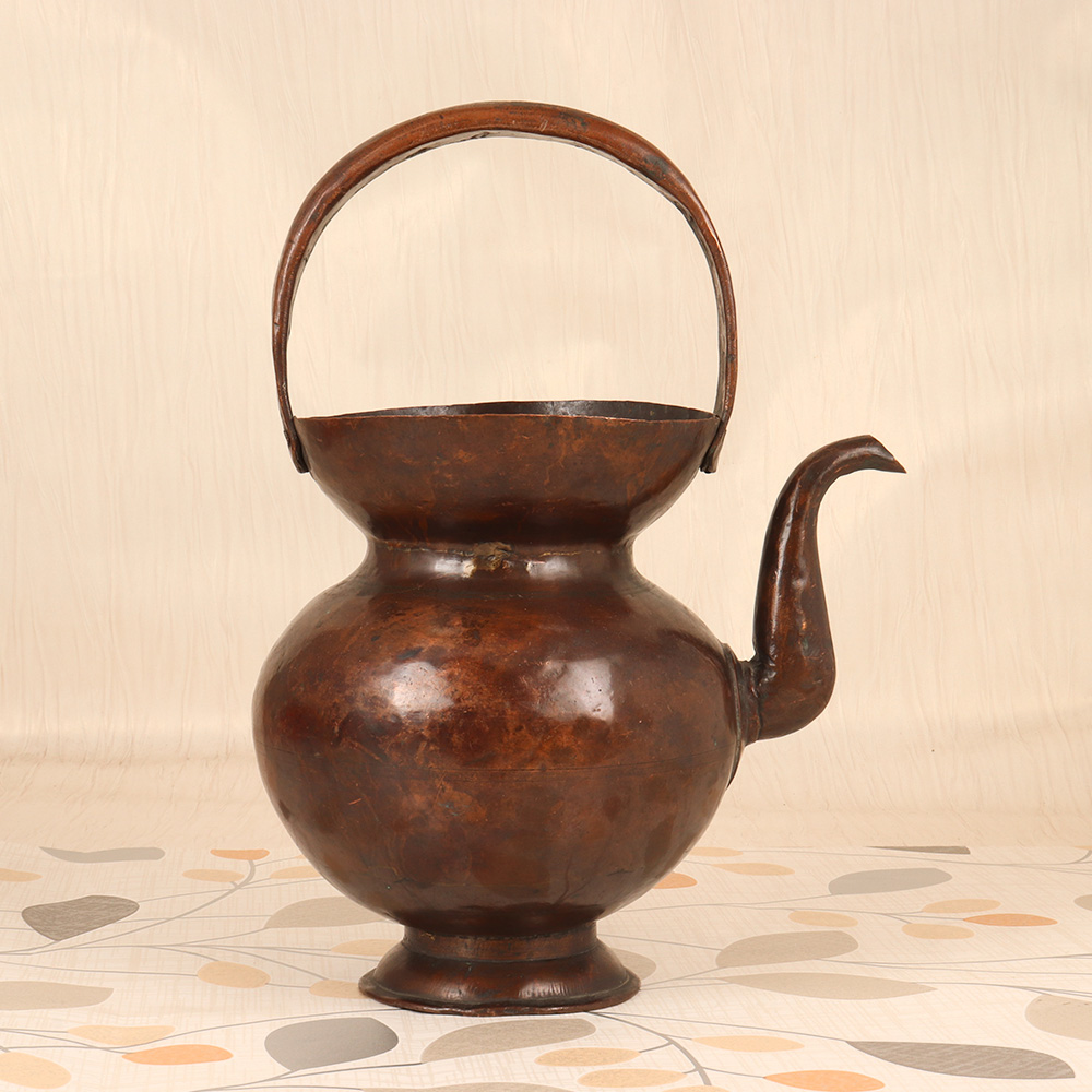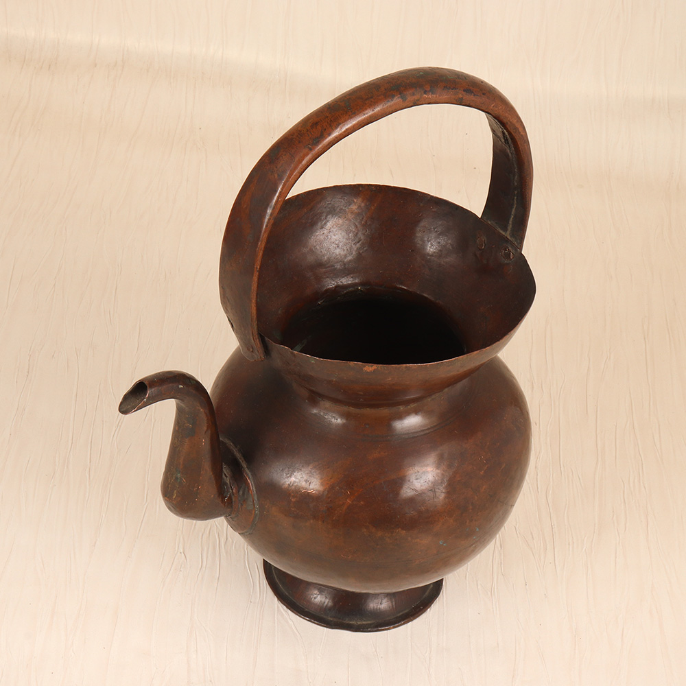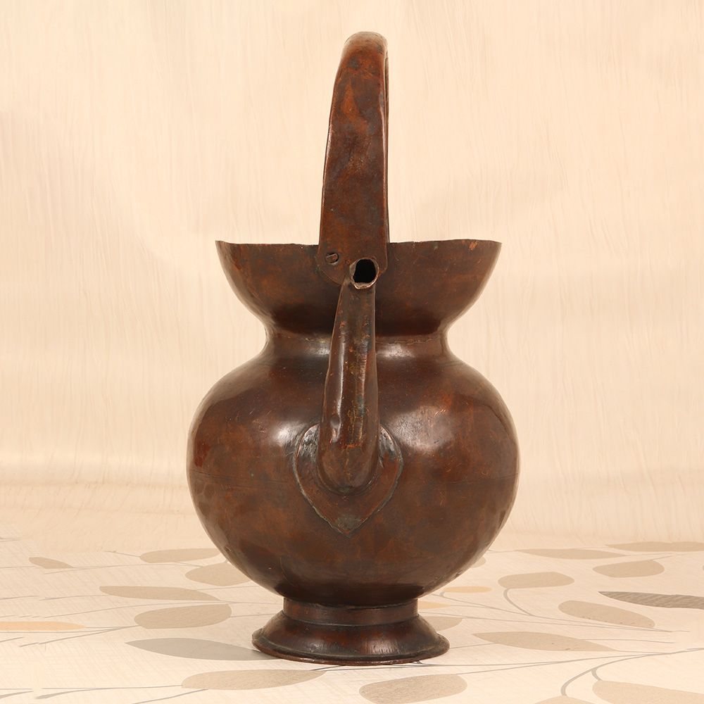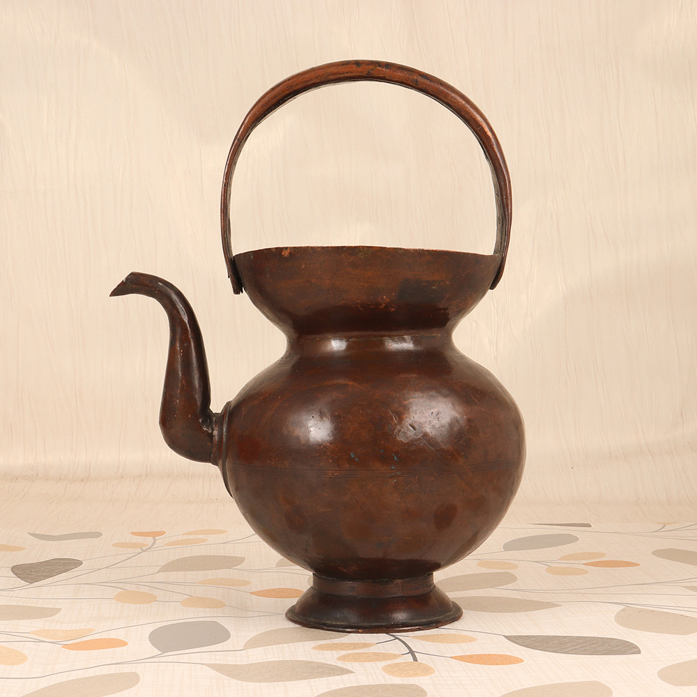 Elevate your spiritual practice with the captivating presence of this vintage copper Kamandal. Meticulously crafted by skilled artisans in the Himalayan region, this sacred vessel embodies the timeless wisdom and mystical energy of ancient Eastern traditions. Copper is revered for its ability to balance the mind, body, and spirit, making it the perfect material for this ceremonial vessel. As you pour water or oils from the Kamandal, you'll feel a profound sense of grounding and centeredness wash over you. Whether you're an experienced yogi, meditation practitioner, or simply seeking to deepen your connection to the divine, this Kamandal will become an indispensable tool in your spiritual toolkit. The Kamandal's plain brown finish lends it a rustic, understated elegance that will complement any sacred space or altar. Its simple yet striking silhouette is sure to captivate all who behold it, serving as a stunning visual anchor for your mindfulness rituals and ceremonies. Invite the timeless wisdom of the Himalayas into your home and let this Kamandal elevate your spiritual journey to new heights.