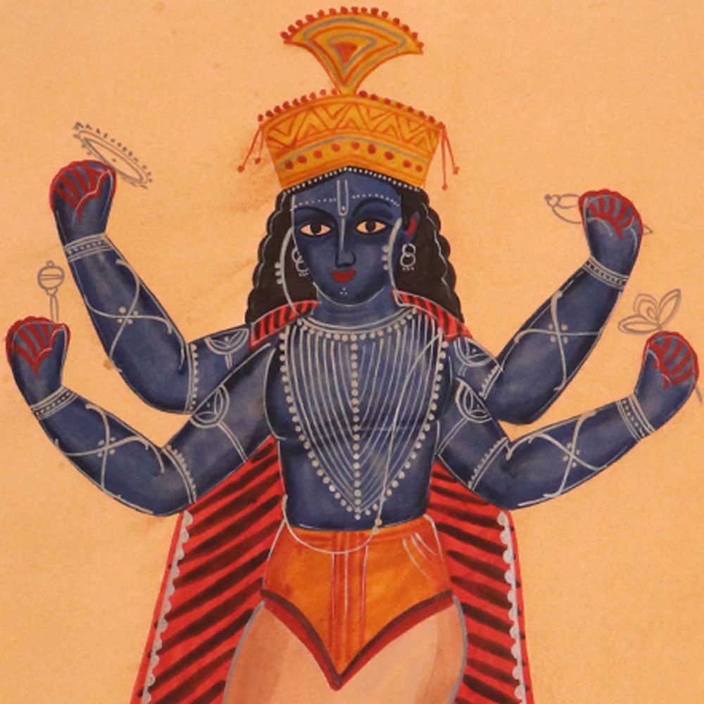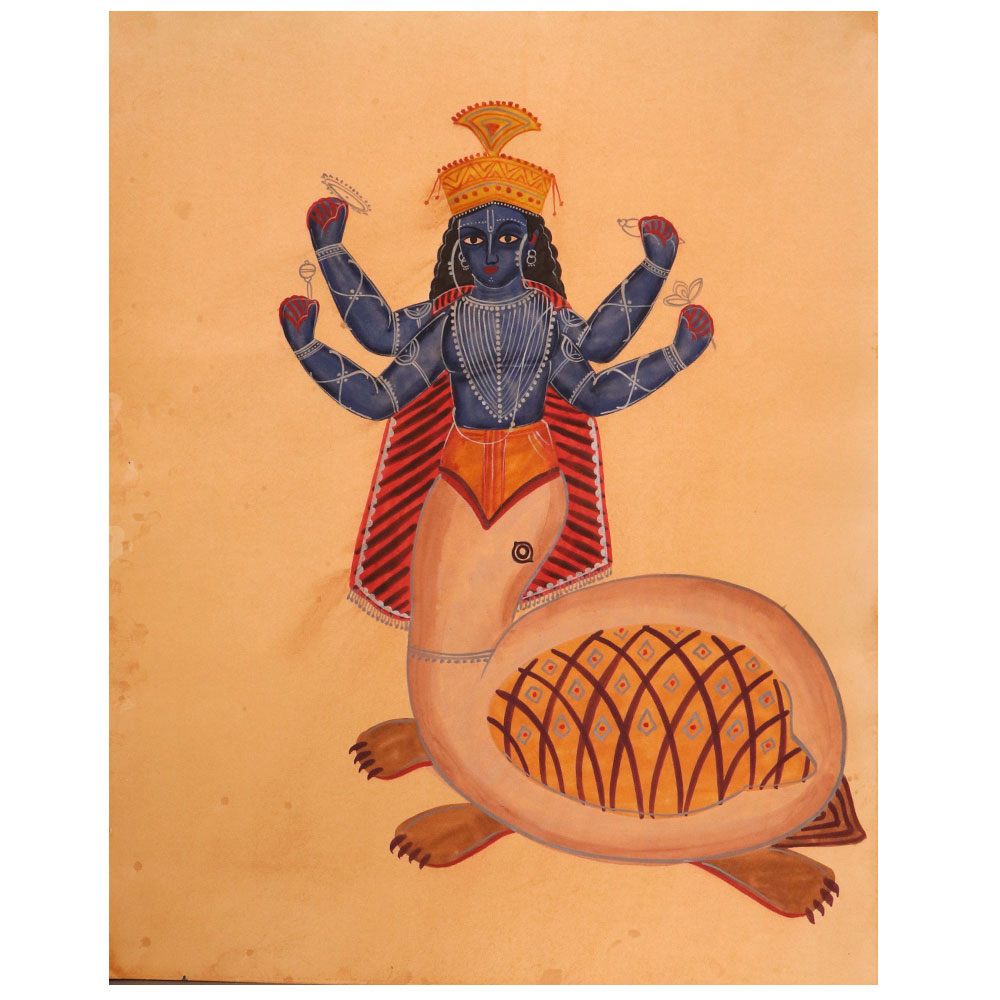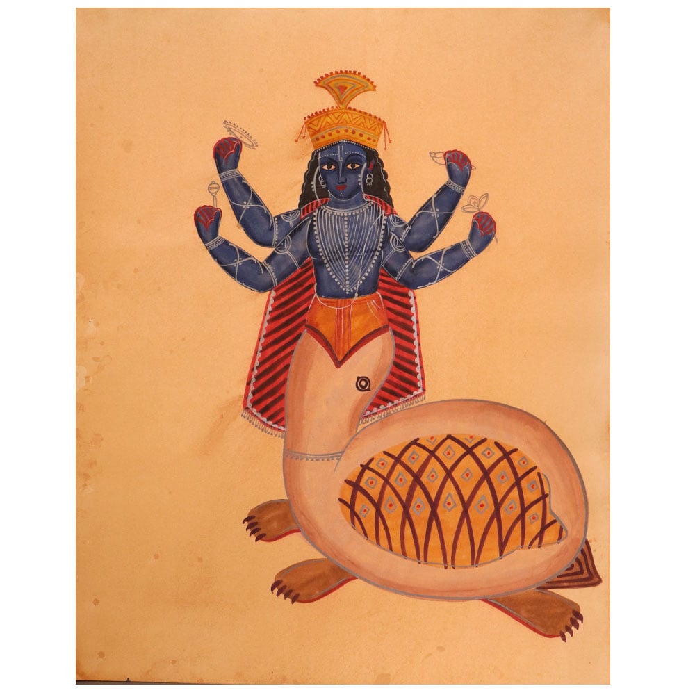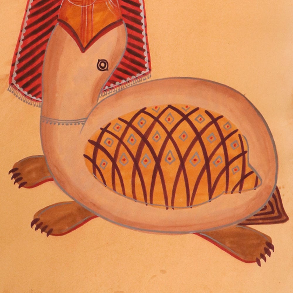 Prepare to be captivated by the sheer beauty and timeless elegance of this vintage calendar art paper painting. Featuring a stunning depiction of a Hindu God nestled within the mouth of a majestic turtle, this one-of-a-kind piece will transport you to a world of ancient wonder and spiritual enchantment. This exquisite painting is more than just a work of art it's a gateway to a rich cultural heritage and a powerful symbol of the interconnectedness of all life. Display it in your home or office to infuse your surroundings with a sense of serenity, wisdom, and timeless beauty. Whether you're a collector of fine art or simply seeking to add a touch of spiritual elegance to your decor, this vintage calendar painting is a must-have addition to your space.