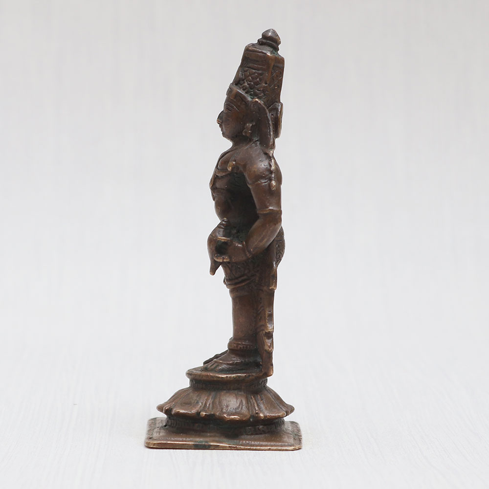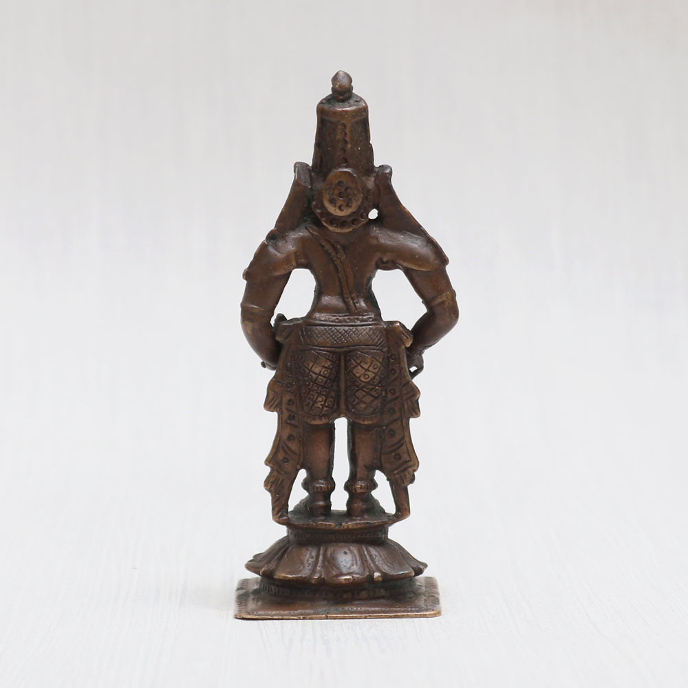 Embrace divine serenity with this exquisitely crafted copper statue of Lord Vishnu, a masterpiece handmade by skilled Indian artisans. Meticulously sculpted from high-quality copper, this magnificent creation stands tall on an ornate platform, boasting a vintage-style finish that adds a touch of antiquity to its allure. The statue's eye-catching detailing captures Lord Vishnu's essence, making it an ideal centerpiece for your prayer room at home, office, restaurant, cafe, or shop. Perfect for exhibitions, decorations, and collections, this statue of Lord Vishnu, among other Hindu idols and god statues for home mandir online, holds timeless appeal. It offers an ideal addition to temples for worship and serves as an auspicious gift for your loved ones on special, festive, or sacred occasions.