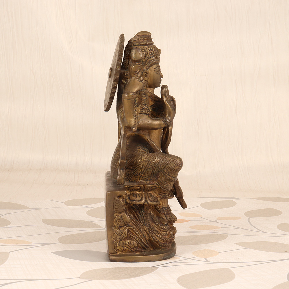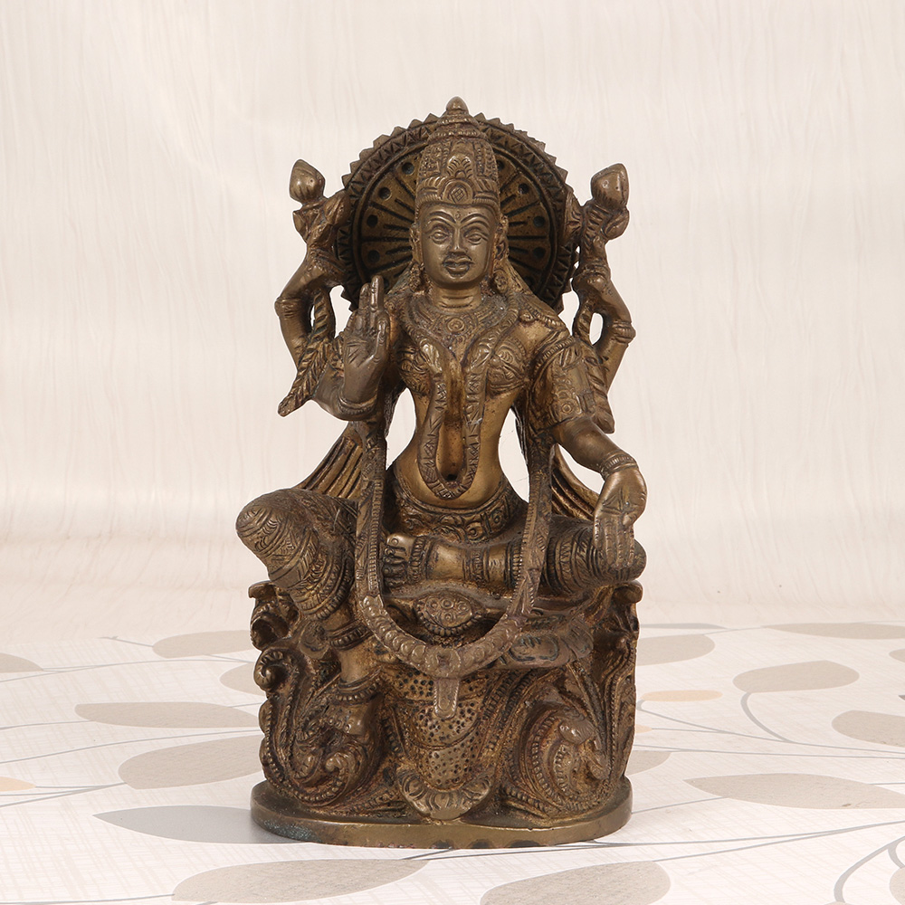 Regal and resplendent, the Goddess Lakshmi Statue commands attention with its timeless elegance. This exquisite piece of Karnataka art is a stunning centerpiece that will elevate the beauty of any space. Lakshmi, the Hindu goddess of wealth, prosperity, and fortune, gazes benevolently upon all who behold her. This vintage brass statue captures her essence perfectly, radiating an aura of abundance and divine blessings. Place her in your home or office, and allow her calming energy to inspire feelings of calm, clarity, and optimism. This Lakshmi statue is a truly special piece of art, created with meticulous craftsmanship that has been passed down through generations of artisans in Karnataka. It's a timeless treasure that will be cherished for years to come, serving as a stunning focal point and a reminder to cultivate gratitude, generosity, and spiritual abundance in your life.