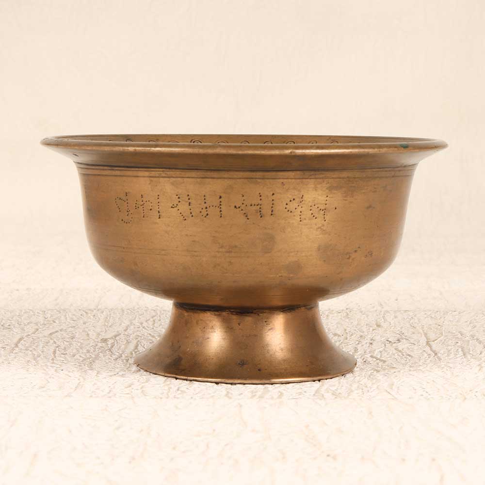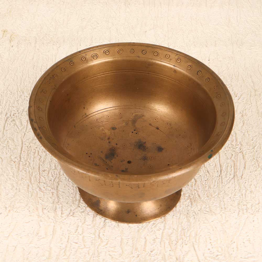 Add a touch of the divine to your prayer rituals with the bell metal holy kumkum cup. This vintage prayer accessory is crafted from solid bell metal, lending it a weighty, substantial feel and a melodic ring when rung. The traditional flared shape is perfect for holding and carrying the vibrant red kumkum powder, making it easy to mark your forehead for puja or adorn deities and idols. With an antique patina that develops over decades of use, each kumkum cup has a storied history of spiritual ceremonies. For devotees who wish to connect more deeply with tradition and heritage during their practice, this bell metal cup makes a resonant, meaningful addition to the home shrine. Allow its ringing to focus the mind and summon the Gods before prayer.