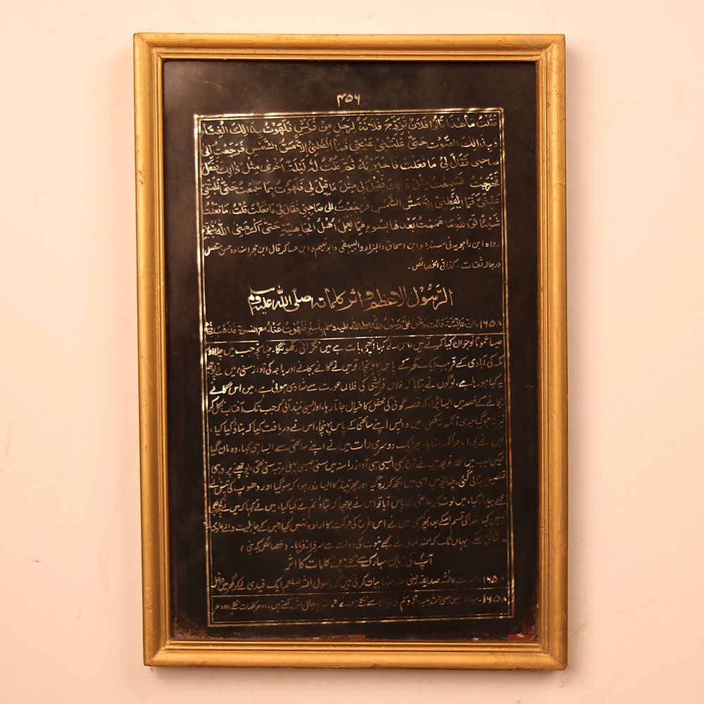 - Handcrafted Islamic glass monument featuring intricate calligraphy and sacred symbols