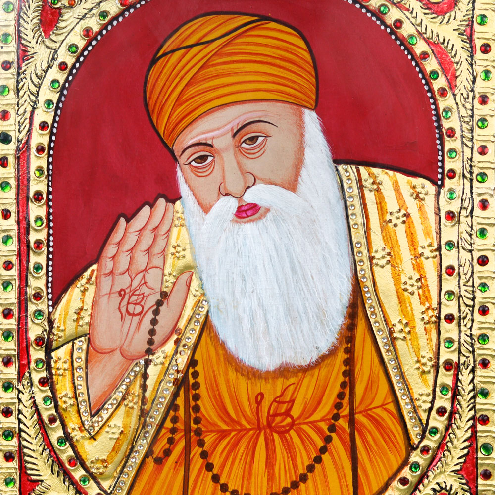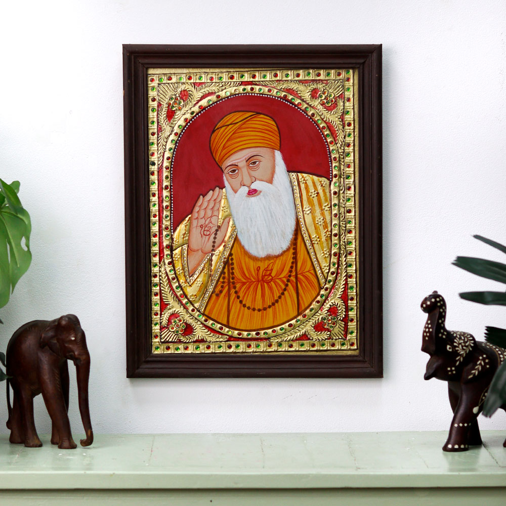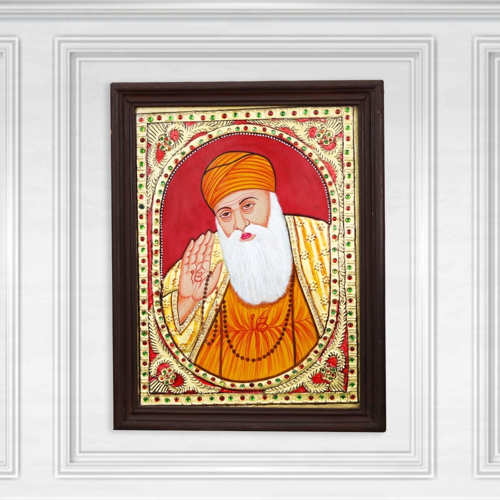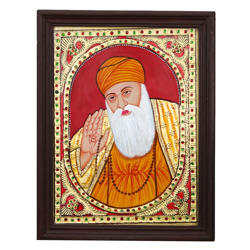 Bring the sacred legacy of Sikhism into your home with this breathtaking Tanjore painting of Guru Nanak. Masterfully crafted by renowned Indian artists, this exquisite work of art captures the profound wisdom and spiritual essence of the revered founder of the Sikh faith. This Tanjore painting of Guru Nanak is a stunning visual representation of the enlightened teacher who dedicated his life to spreading the message of universal brotherhood, equality, and devotion to the divine. The rich, jewel-toned palette and ornate embellishments capture the sacred aura and regal dignity of this iconic spiritual leader. Whether you're a devoted Sikh or simply appreciate fine Indian art, this Tanjore painting will be a magnificent addition to your home, filling the space with an air of reverence and inspiration. Display it in your meditation corner, living room, or entryway to ignite a sense of inner peace and remind you to live by the Sikh principles of honesty, service, and connection to the divine.