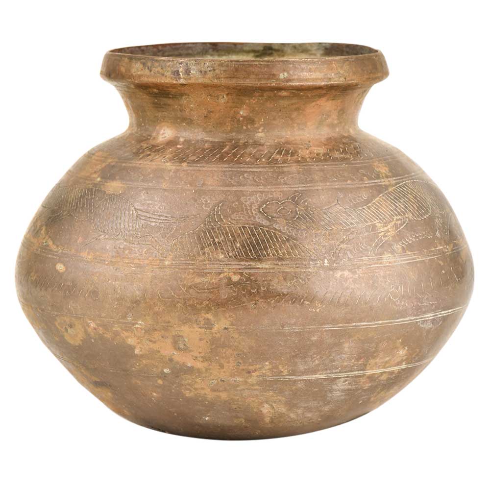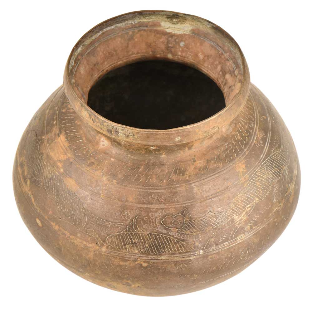 This Handmade Brass Holy water pot made by exoert craftemen has vertical lines brass on the centre of the pot . The pot is slightly broad at the centre and narrow towards the mouth .Used in temples and other places of worship .