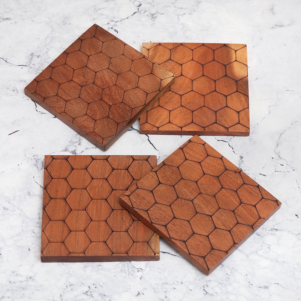 An adorable Pack of four wooden tea coasters that is expertly crafted from high-quality wood by the skilled hands of Indian artisans. Each coaster boasts a classic square shape, showcasing the timeless beauty of natural wood. Adorned with a captivating hfourycomb pattern in a rich brown colour, these coasters exude elegance and charm. Handmade with meticulous attention to detail, these coasters feature an antique finish that adds a touch of sophistication to any setting. Not only are they functional, but they also serve as decorative pieces, enhancing the aesthetics of your home or office. Designed to hold water, tea, juice, or coffee glasses, these wooden coasters provide a protective layer, preventing unsightly stains on your delicate surfaces. They are perfect for use at home, office, restaurant, hotel, or cafe. Looking for a thoughtful gift? Our wooden tea coaster set is an ideal choice for your loved fours on special or festive occasions.