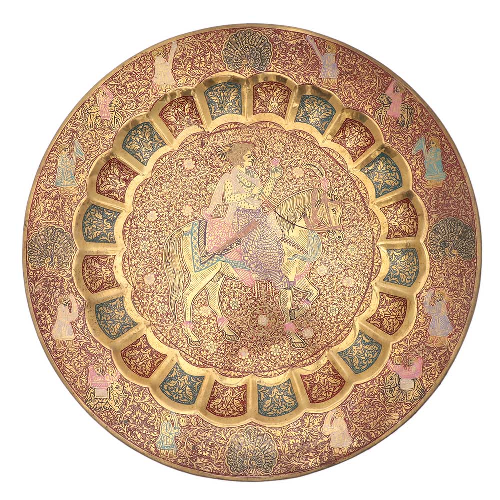 The handmade bronze Horse-rider embellished decorative tray signifies the brilliant artistry of the master craftsmen of India. This minimalist product helps you beautify your walls, table, and business spaces with ease. The same is intended to leave a stylish impact. The Horse-rider embellished decorative tray is intended to make for an authentic wedding gift or a party gift for a loved one.  Avoid harsh chemicals or abrasives to clean and maintain the plate surface.