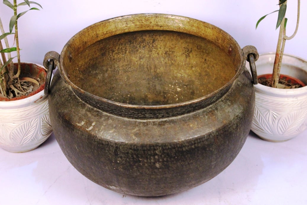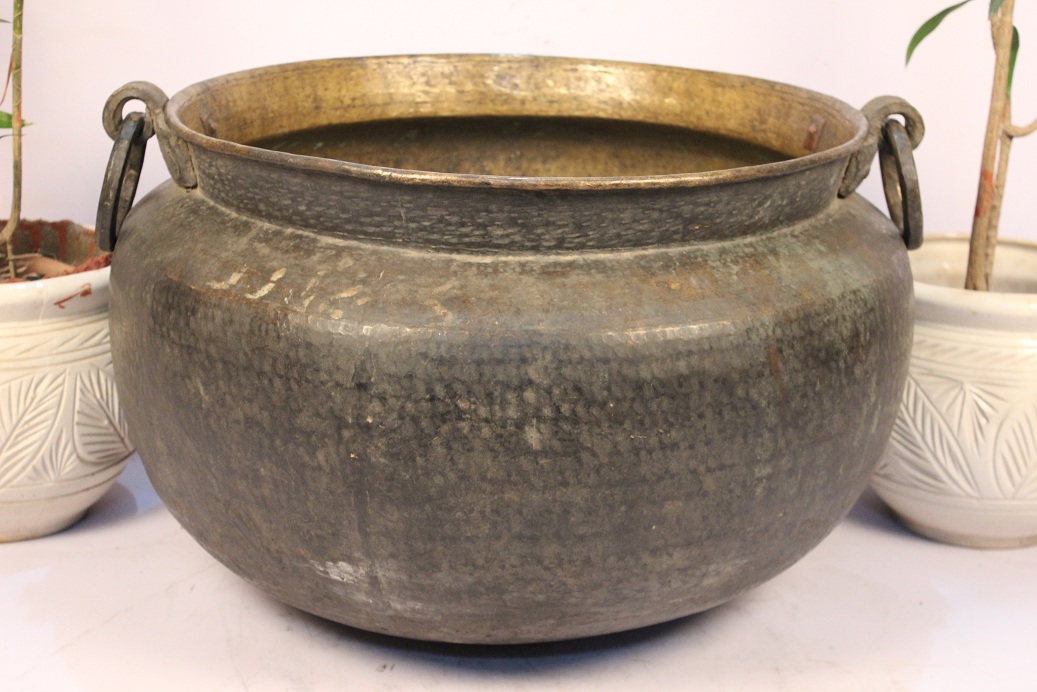 Vintage brass planter chic and stylish, this is an absolutely fabulous huge vintage brass planter! Vessel has a hammered finish, pot shaped vessel, and appealing nailhead style trim around the top edging. Bronze Planter. It is Handmade by Skilled Indian CraftsmenBronze Planter. It is Handmade by Skilled Indian Craftsmen.