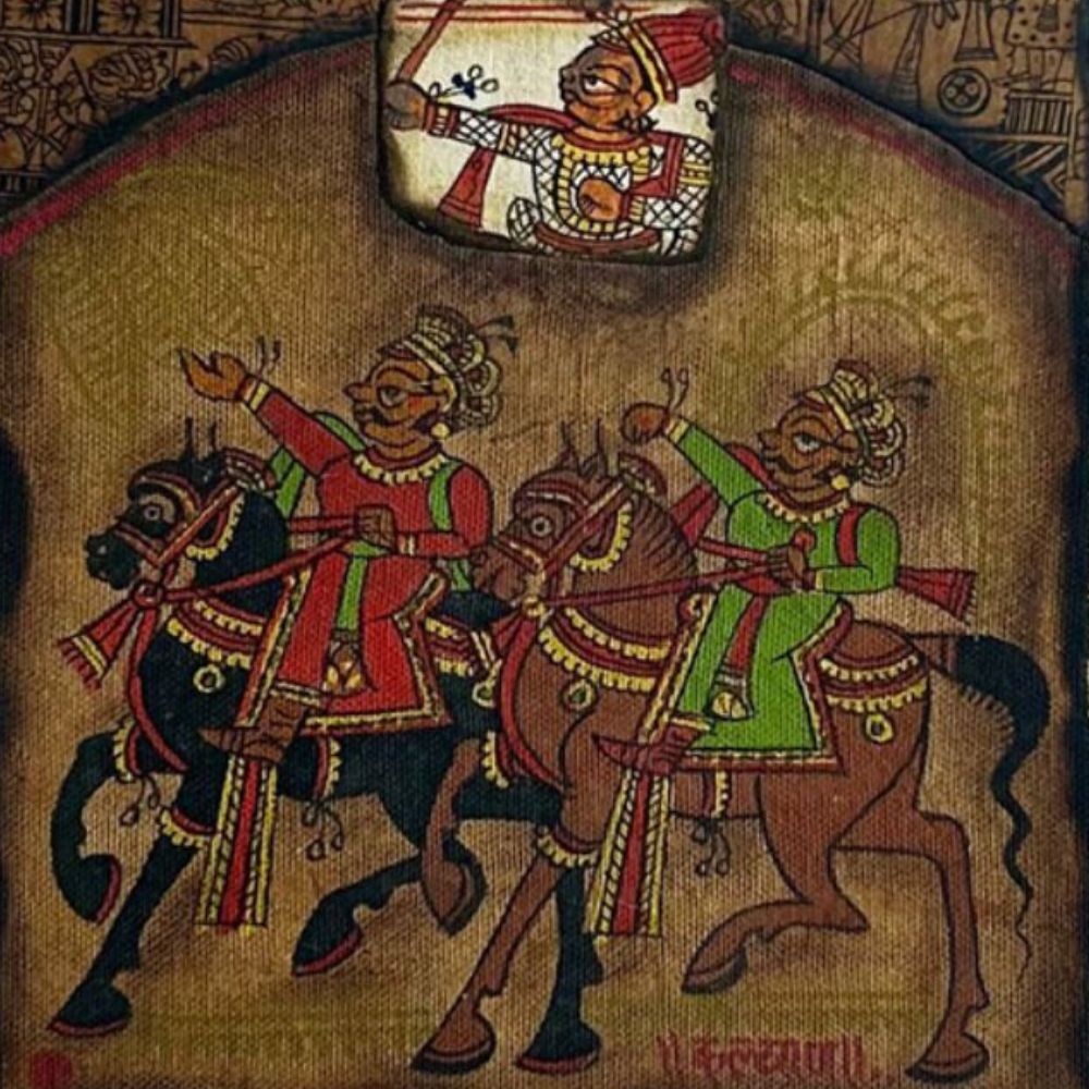 This Phad Painting in raw colour on cloth is a masterful representation of Rajasthan’s legendary folk art tradition. Phad paintings, historically used as storytelling scrolls, narrate the heroic tales of local deities, warriors, and rulers through intricate visuals and symbolic detailing. This artwork vividly brings that tradition to life, combining bold natural pigments, expressive figures, and cultural motifs. The central composition showcases valiant horse riders, richly adorned in regal attire, symbolizing bravery and honor. Above them, detailed miniature storytelling scenes unfold within decorative arches, reflecting the continuity of oral and visual traditions. The use of earthy reds, greens, browns, and blacks stays true to the natural palette that defines authentic Phad art. Every stroke is meticulously hand-painted, offering a glimpse into Rajasthan’s glorious past. The distressed texture of the cloth base enhances its rustic authenticity, giving the artwork a timeless, archival feel. More than décor, this painting serves as a cultural artifact that bridges history, spirituality, and artistry. Perfect for collectors, heritage lovers, or as a striking wall feature, it embodies devotion, valor, and tradition in one frame.