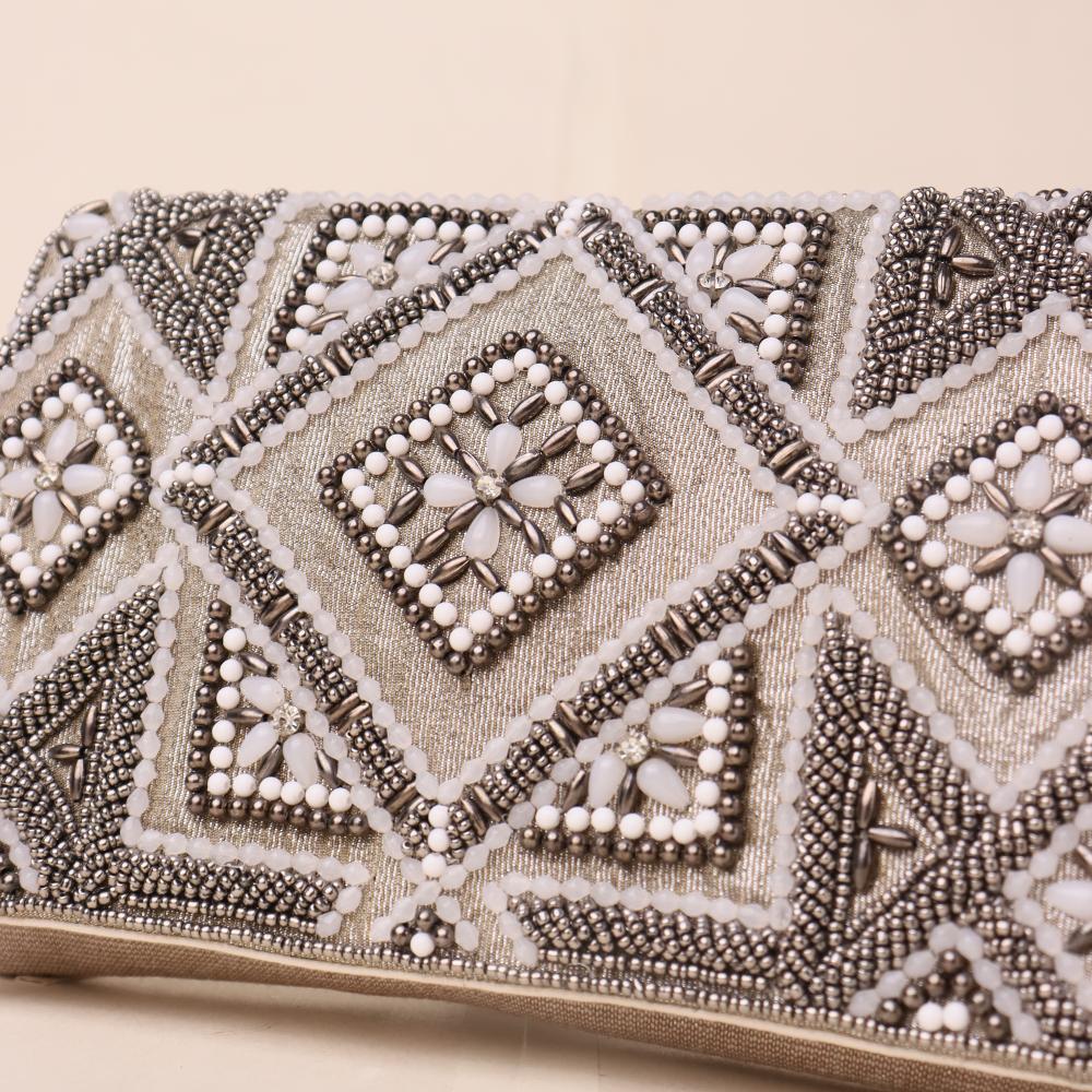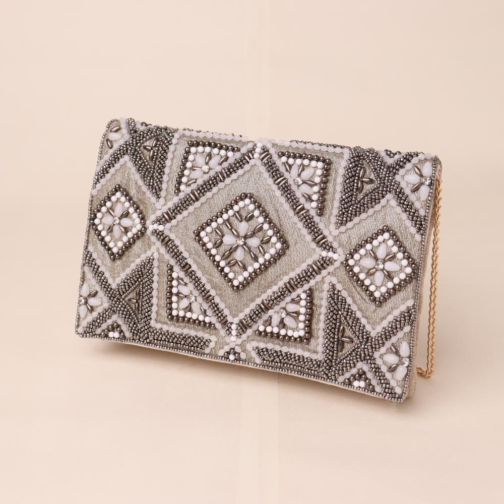 Elegant and ornate, this clutch embodies timeless glamour with its intricate hand-beaded design and regal diamond motifs. Designed to elevate your look for weddings, receptions, or formal soirées, it features meticulous detailing that adds a luxurious texture and shimmer. Includes a sleek gold-tone chain strap for convenient shoulder carry, allowing you to switch from handheld to hands-free with ease.