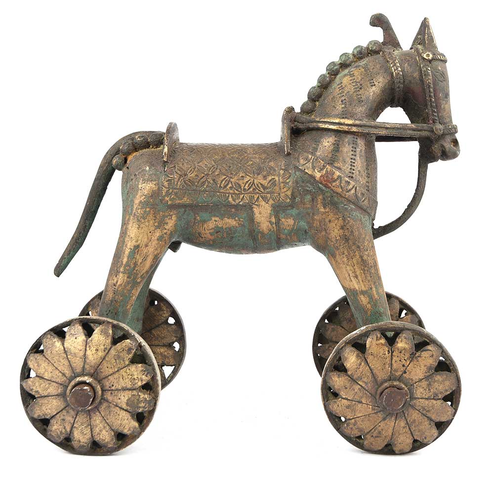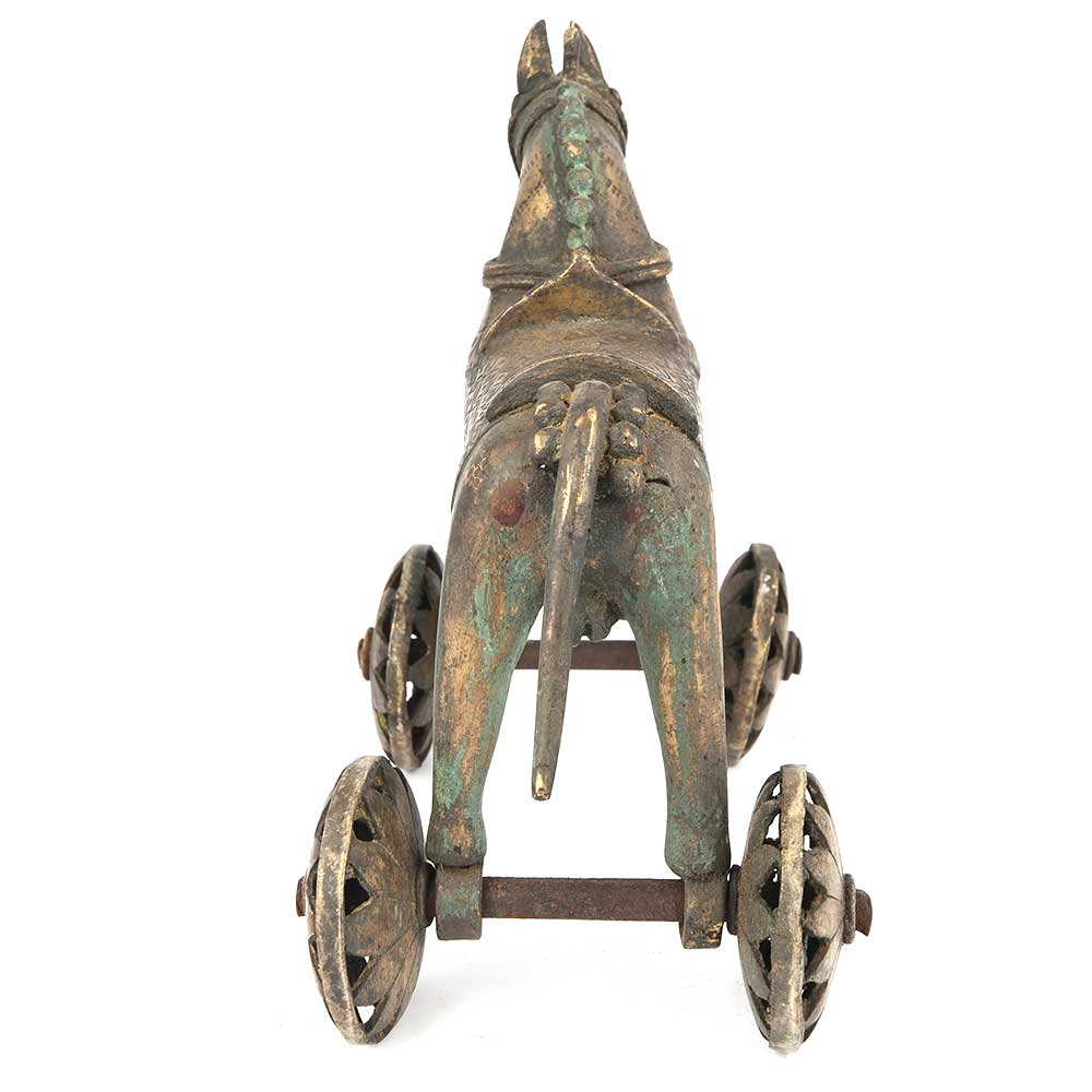 India Brass Temple Toy Horse on Wheels