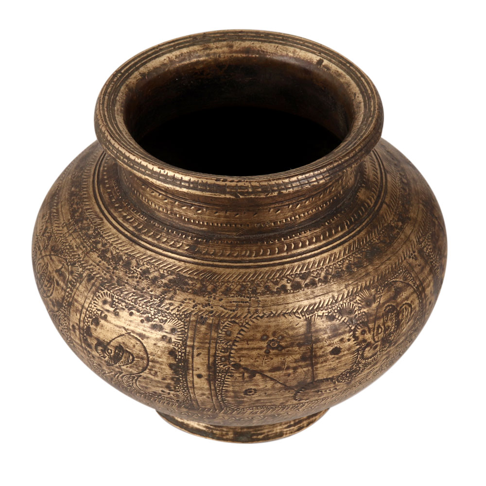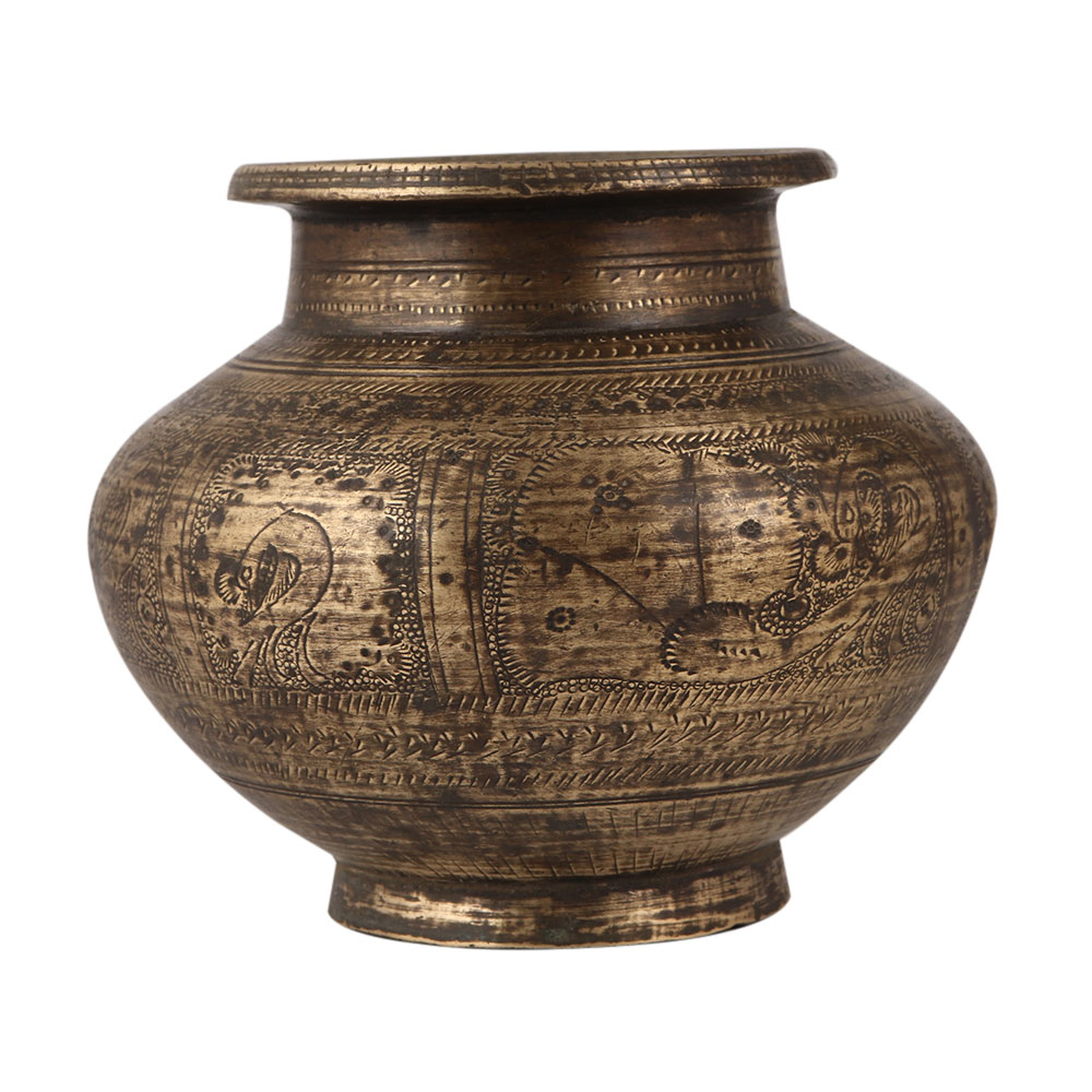 Embrace the timeless charm and spiritual essence of a brass holy water pot, connecting with ancient traditions while adding beauty to your surroundings. This brass holy water pot in antique brown finish that is an exquisite piece engraved with beautiful designs that reflects the rich heritage of India. This traditional masterpiece is meticulously handcrafted by highly skilled Indian craftsmen, adding to its allure and uniqueness. Its captivating appearance makes it a standout decorative item that will effortlessly enhance the ambiance of any space. This brass water pot is traditionally used to offer water to deities, the sun god, and Shivling. It also serves as a vessel to store sacred water from the holy river Ganga. During Hindu rituals, auspicious functions, and havans, this pot is indispensable. This versatile piece can also be used as an indoor flower pot, bringing a touch of elegance to your living room or patio garden. Additionally, it makes for a thoughtful and meaningful gift for your family, friends, or relatives on special occasions, festivals, or auspicious events.