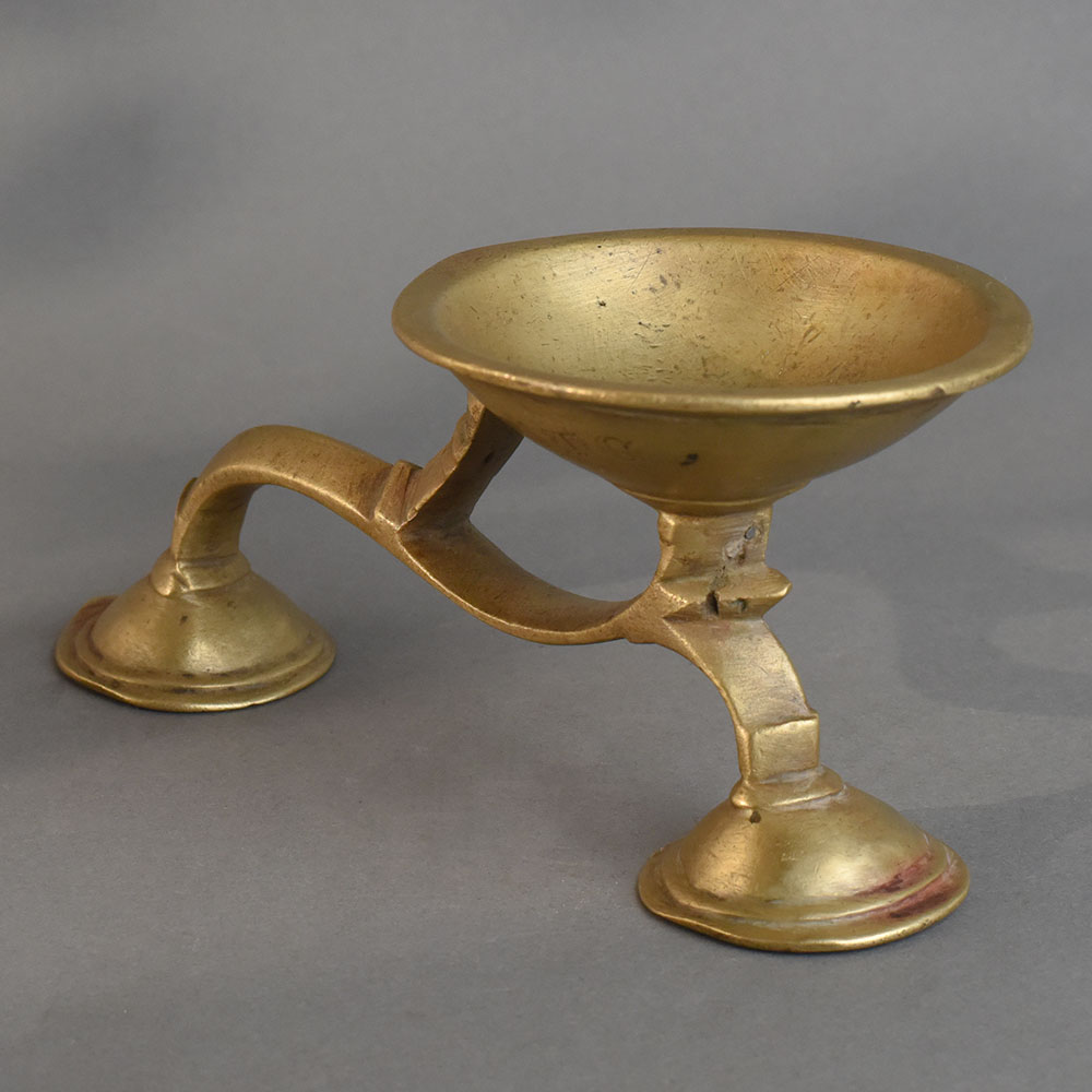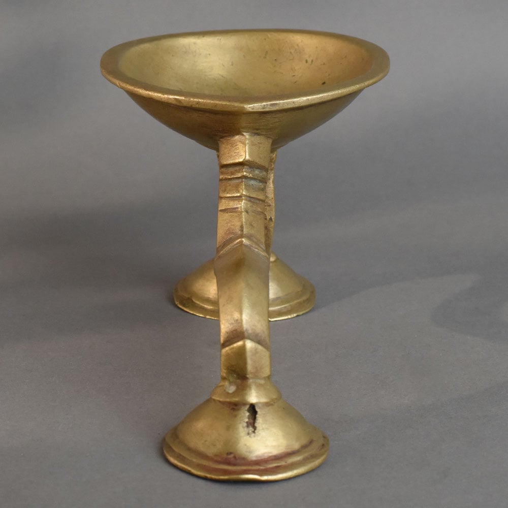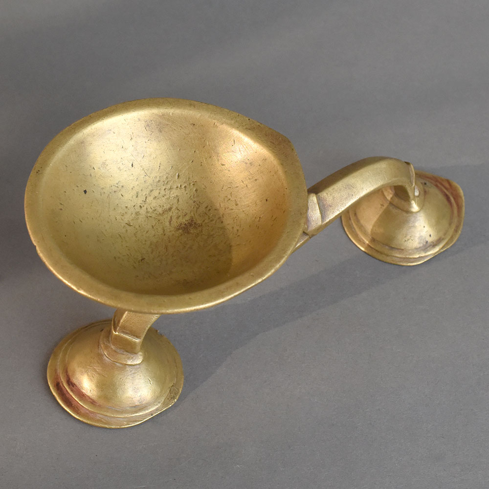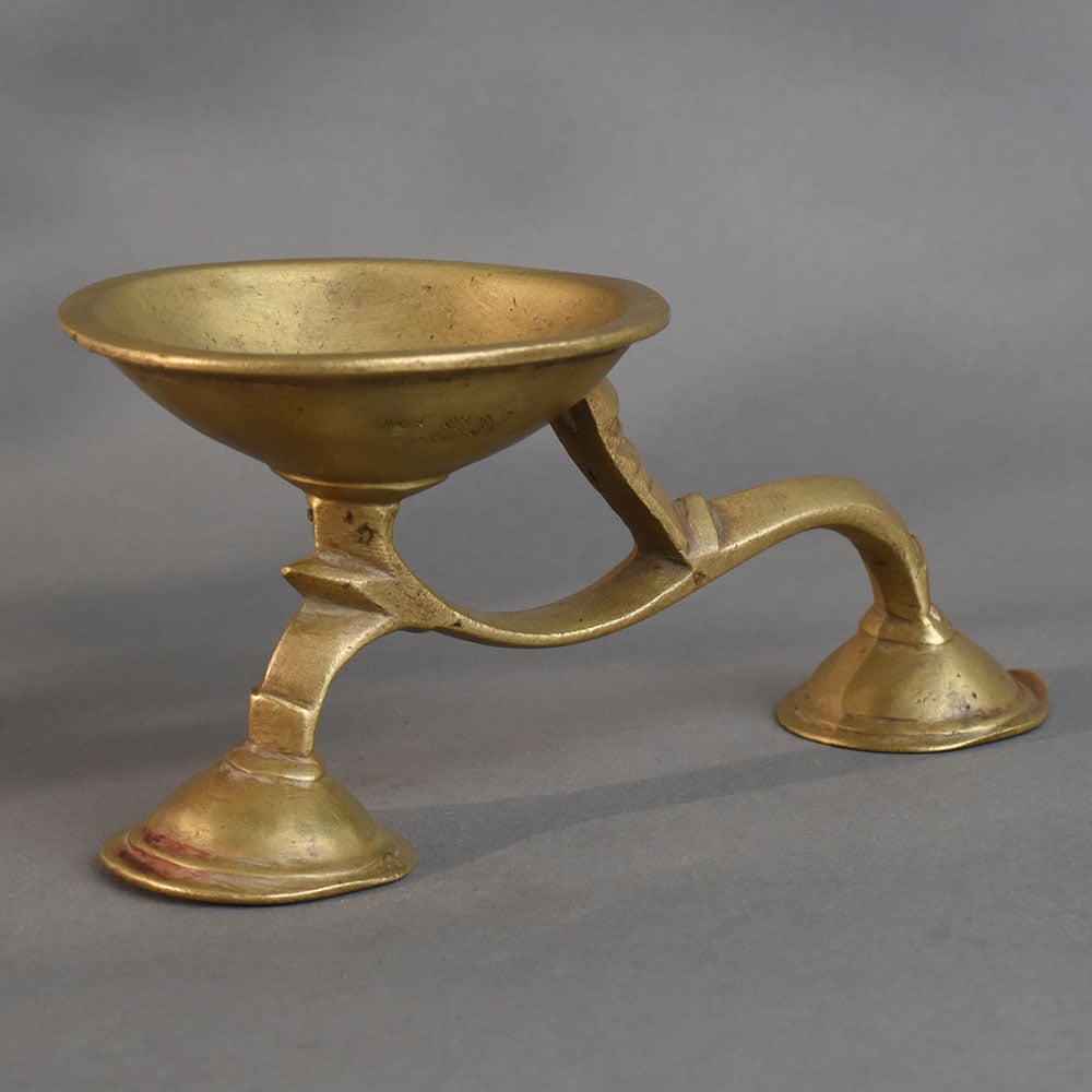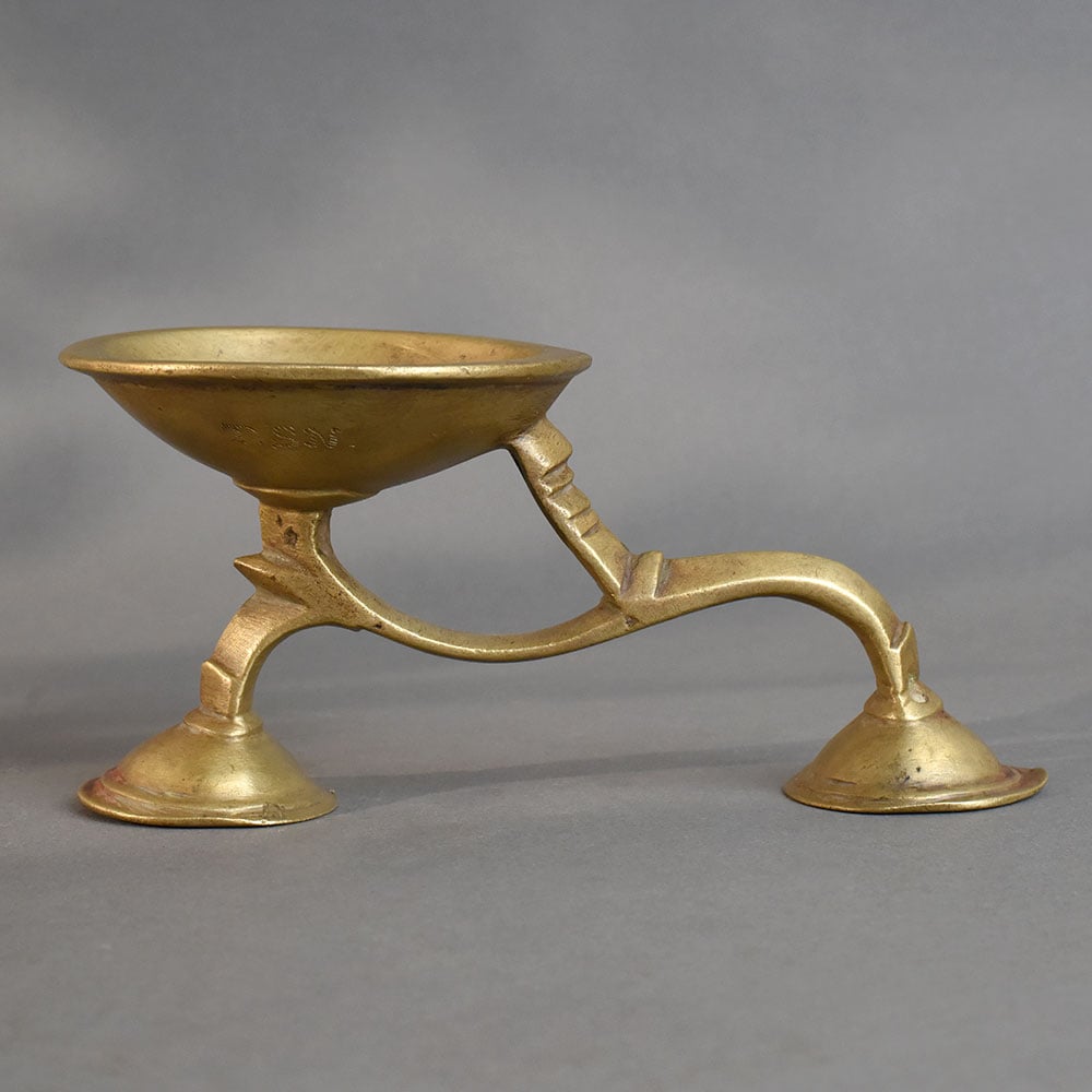 This antique brass aarti oil lamp with handle is a beautifully handcrafted piece that carries the essence of Indian devotional traditions. Designed with a broad, deep bowl, it holds ample oil or ghee to keep the sacred flame glowing during rituals and ceremonies. The lamp is supported by a strong dual-footed base with a curved handle-like structure, ensuring both balance and easy handling. Its simple yet elegant design highlights the purity of traditional craftsmanship while the natural patina adds vintage charm. Ideal for pooja rooms, temples, or heritage-inspired decor, this lamp symbolizes light, devotion, and positivity. A timeless collectible, it is perfect for those who value spiritual artifacts and Indian culture.