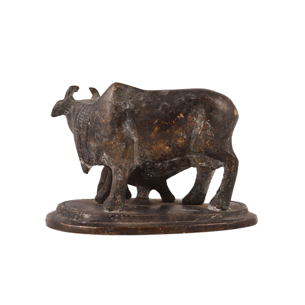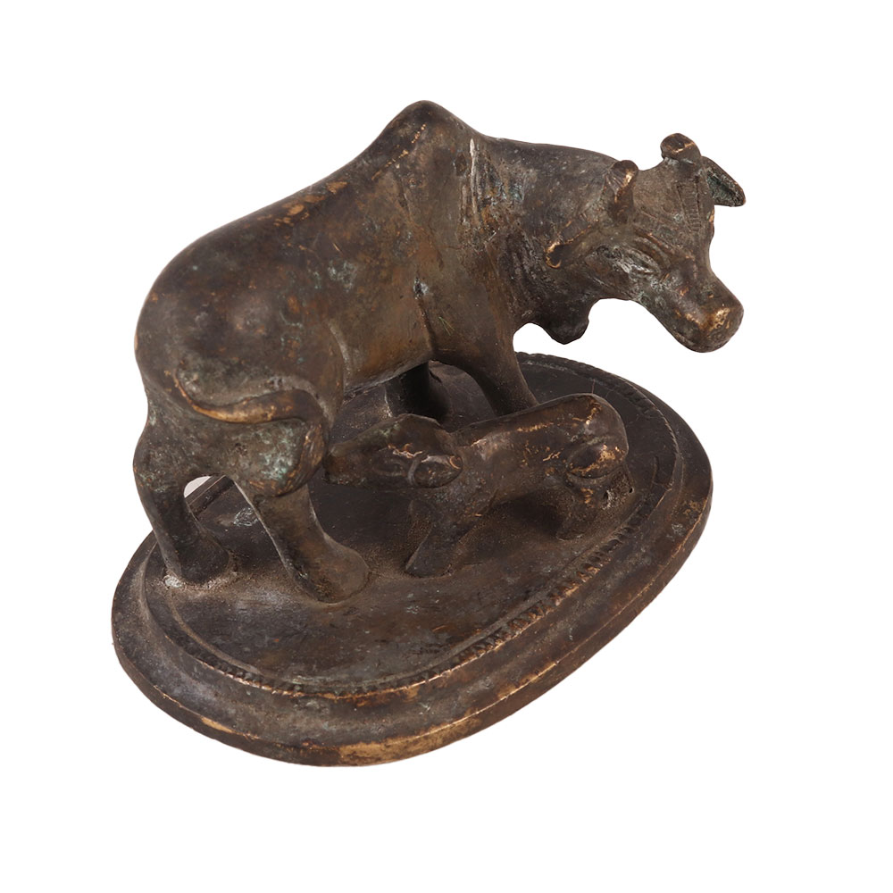 A small brass statue of a cow and calf that is a beautiful and auspicious piece of art, widely recognized as sacred in India. This statue is crafted with intricate detailing and a dark finish that adds an elegant touch. The cow and calf are revered in Indian culture as symbols of motherly love, compassion, and nourishment. This brass statue captures the essence of these attributes, making it a perfect addition to any collection or decorative display. Its small size makes it ideal for display on a desk or shelf. This small brass statue of a cow and calf also makes a thoughtful and meaningful gift for friends, family, and relatives who appreciate the cultural and spiritual significance of this sacred animal.