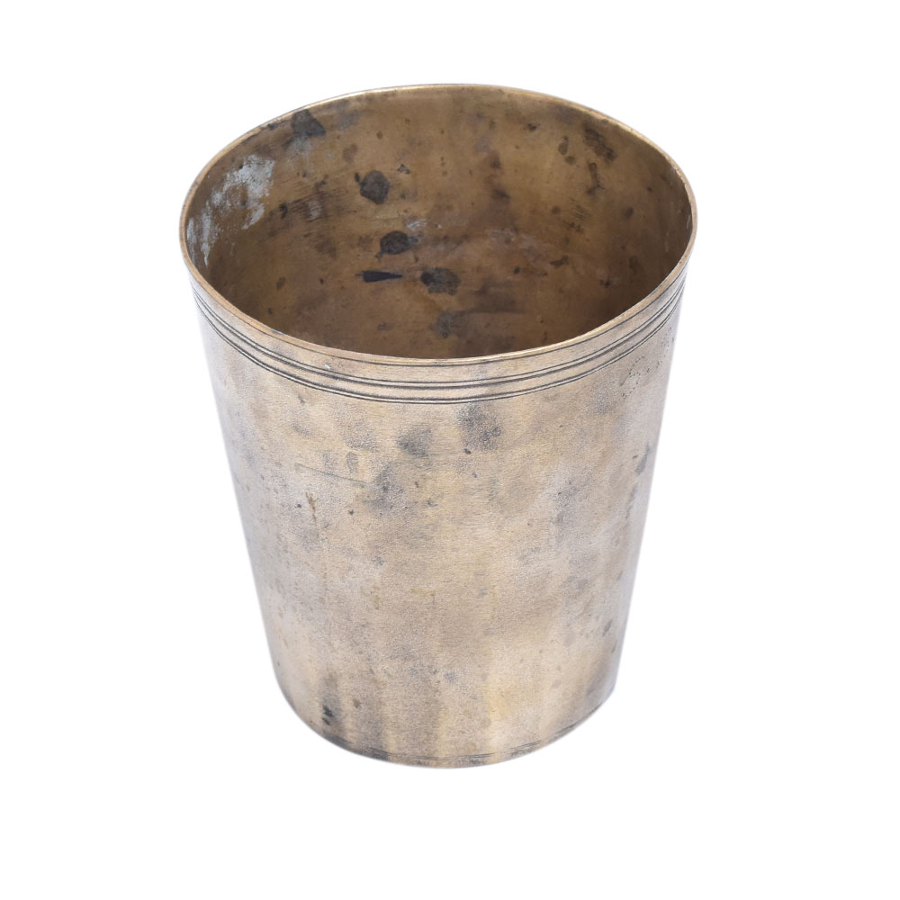 Indian brass handmade Tumbler or glass for Lasssi. Lasssi is a yoghurt drink from the northern Indian states of Punjab and Rajasthan. Lasssi is now made in a variety of ways, with ingredients such as mango, honey, and spices. Lasssi cups now make excellent vases or beakers for storing paint brushes or kitchen utensils. Excellent condition! This brass glass is ready to join your collection. Incredible Collection Piece.