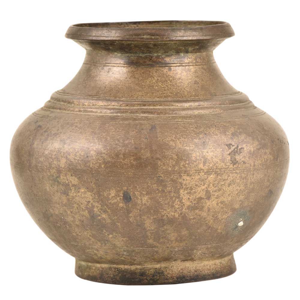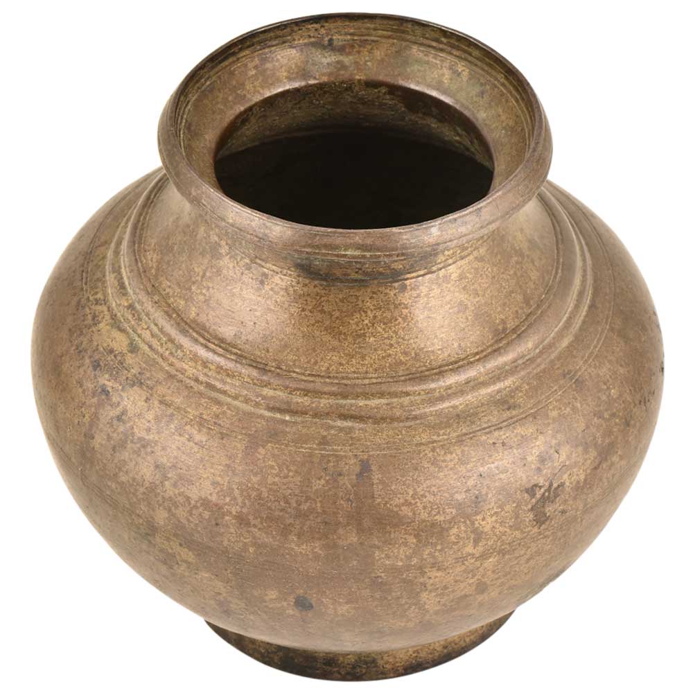 This is a typical Ganga lota shape made by local artisans of India with a wide base and narrow mouth. It has a typical Indian design which slowly tapers towards the neck with a strong neck rim.