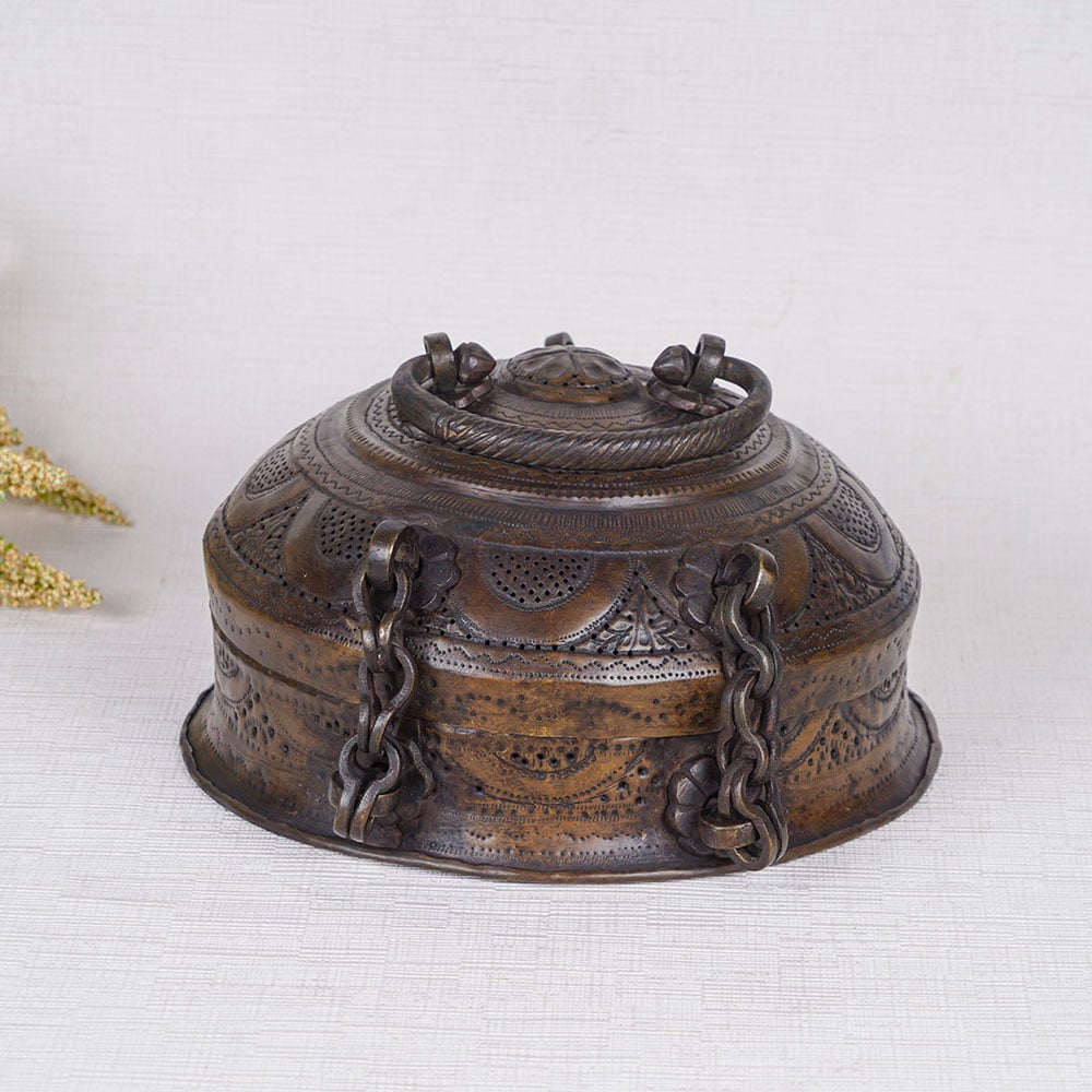 Buy an antique Brass Jewelry Box online that is a stunning vintage piece that exudes elegance and charm. This captivating box showcases a round shape with a rich black hue, creating a striking contrast against the radiant brass. A delicate latch secures the contents within, while a convenient handle adorns the top for easy transport. Crafted by skilled Indian artisans, this jewelry box is a testament to traditional handmade craftsmanship. The surface is adorned with intricate engravings, showcasing beautiful designs that highlight the rich cultural heritage of India. Originally used in Indian households to store precious jewelry, this box now offers a versatile storage solution for your cherished pieces or small items. Beyond its practical functionality, this jewelry box serves as a remarkable display piece at exhibitions, museums, or your own shop, hotel, or restaurant. Its timeless appeal and exquisite detailing make it an incredible gift for special occasions, delighting your family, friends, or relatives. Whether as a travel jewelry box or an accent piece in your home, this antique brass jewelry box for women encapsulates the essence of timeless beauty and exceptional craftsmanship.