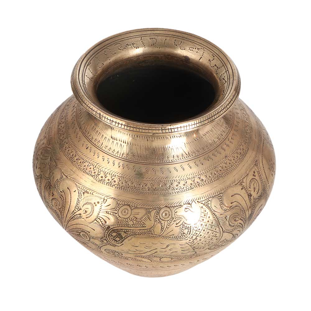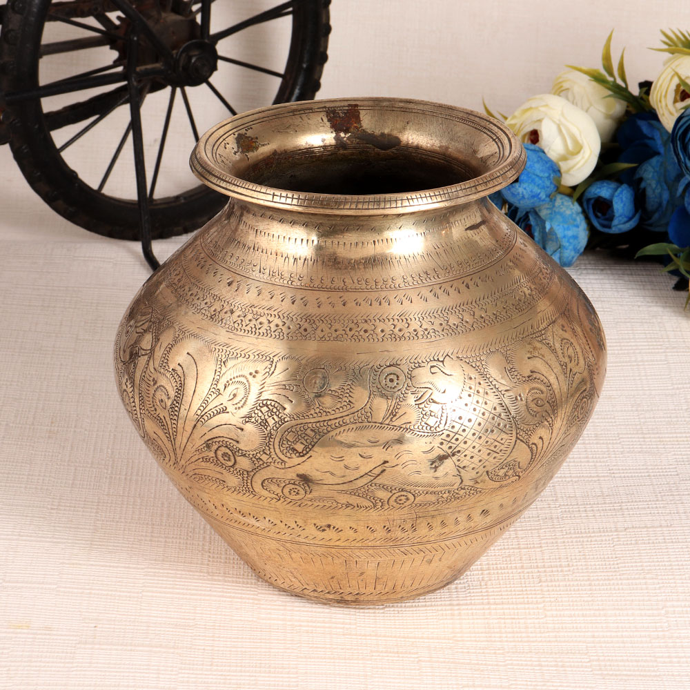 Are you looking for a shiny water pot to decorate your home or restaurant? Then you have landed on the right page. Buy this brass water pot, which is made of high quality brass and has a shiny golden finish with incredible engravings of lion and forest. This decorative water pot is mostly used for decoration at home, restaurant and hotel as a flower pot or sometimes with water to spread the positive energy in the environment. An auspicious lota that you can use during pooja, rituals and events and will be a point of attraction for guests. A decorative water pot to give as a gift to your loved ones for special, festive and auspicious occasions.
