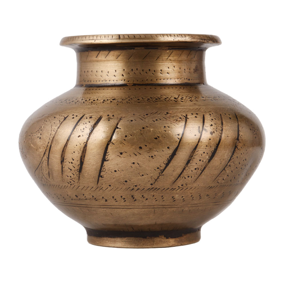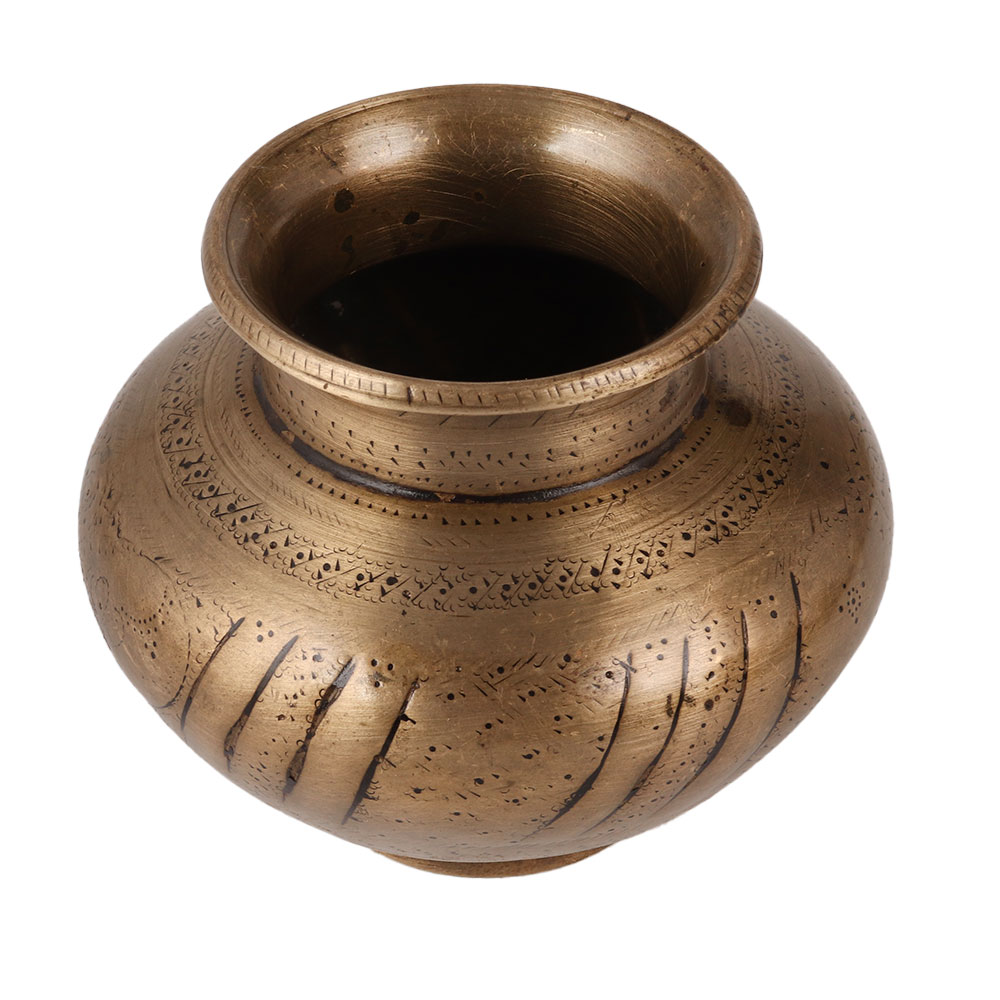 A brass water pot, also known as a Lota, is an incredible piece of artistry and functionality. Handcrafted by highly skilled Indian artisans using traditional methods, this pot showcases intricate patterns and carvings that enhance its aesthetic appeal. Its antique brown finish adds a touch of vintage charm to any setting. In Indian households, the Lota holds great significance as it is used to store water, believed to spread positive energy throughout the home. It is also commonly found in temples, where it is used to offer water to the sacred Shivling or Shivalinga. Additionally, during havans and rituals, this Lota serves as a vessel for holding holy water. Made from high-quality brass, this Lota stands out as a captivating decorative piece. Its fine craftsmanship and attention to detail make it a conversation starter in any room. Furthermore, it makes for an ideal gift to bestow upon family, friends, or relatives during special, festive, or auspicious occasions, symbolizing blessings and good fortune. Embrace the rich heritage and beauty of Indian culture with this exquisite handmade brass water pot.