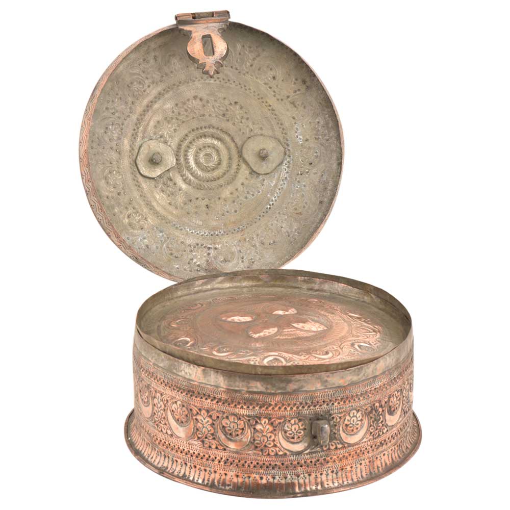 Hand Embossed Copper Betel Nut Pandan Box – with hand hammered floral and incised decoration used to store betel leaf, lime, tobacco and the nut from the areca palm. The practice of chewing betel nut was popular all over Asia and is still a common practice in Myanmar and India. This Pandan betel nut box contains six small pots, each incised on the tops and sides with the same design and metal.