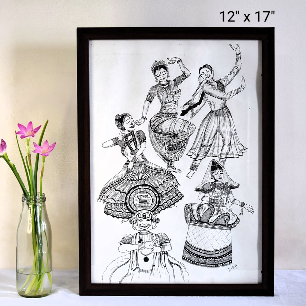 This pen illustration by artist Dimpana beautifully captures the grace and movement of India’s classical dance heritage. Featuring Bharatanatyam, Kathak, Kathakali, Odissi, and Manipuri, each dancer is intricately detailed in black ink on paper. Framed and ready to display, the artwork is a tribute to the timeless rhythm, expression, and storytelling of Indian dance traditions.