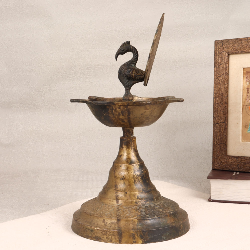 Buy a Vintage Brass Peacock Oil Lamp online that combines elegance and tradition in a single masterpiece. Crafted by professional Indian artisans from high-quality brass, this lamp boasts an antique brown finish that exudes a classic charm. The exquisite engraving on the lamp showcases a meticulously carved peacock on top, adding a touch of regality. Functional and symbolic, this oil lamp accommodates seven jyots, allowing for a captivating display of warm, ambient light. Designed for use with either mustard oil or ghee, it becomes a versatile accessory during special occasions, prayers, or moments of reflection. Its cultural significance makes it a perfect addition to home prayer rooms, offices, restaurants, hotels, or cafes. As a handmade creation, each lamp is a unique testament to the artisan's skill and attention to detail. Consider gifting this Vintage Brass Peacock Oil Lamp to your loved ones on special, festive, or auspicious occasions which is a thoughtful and cherished present that transcends time and cultural boundaries.