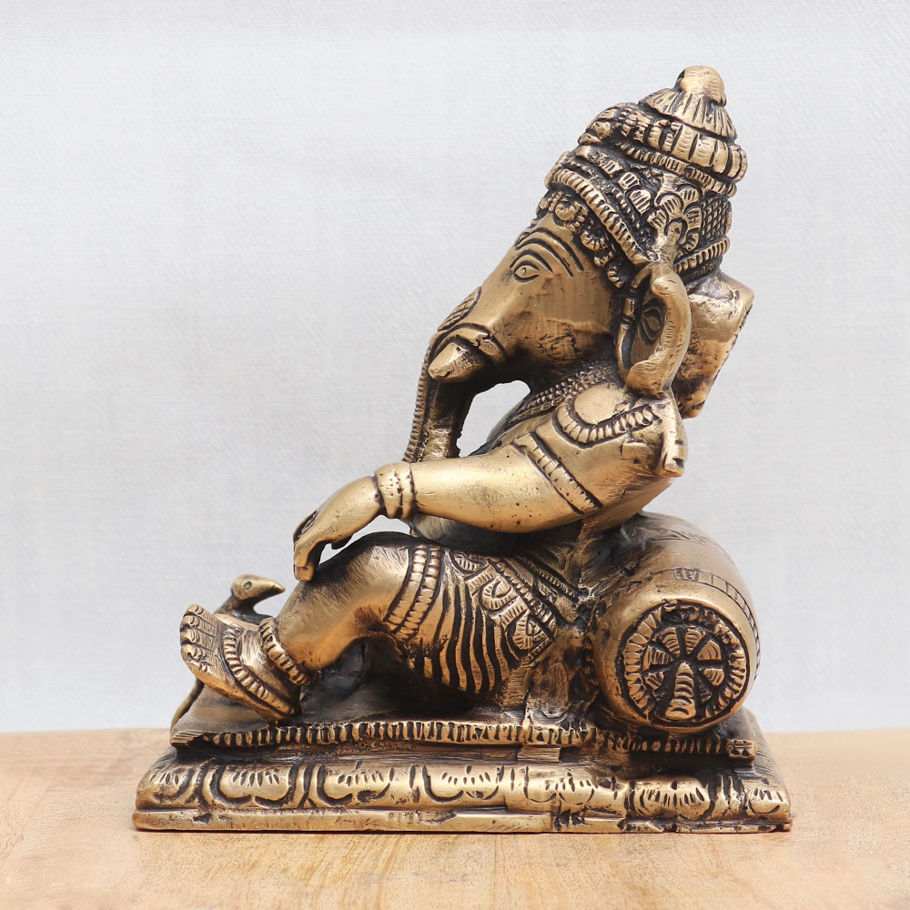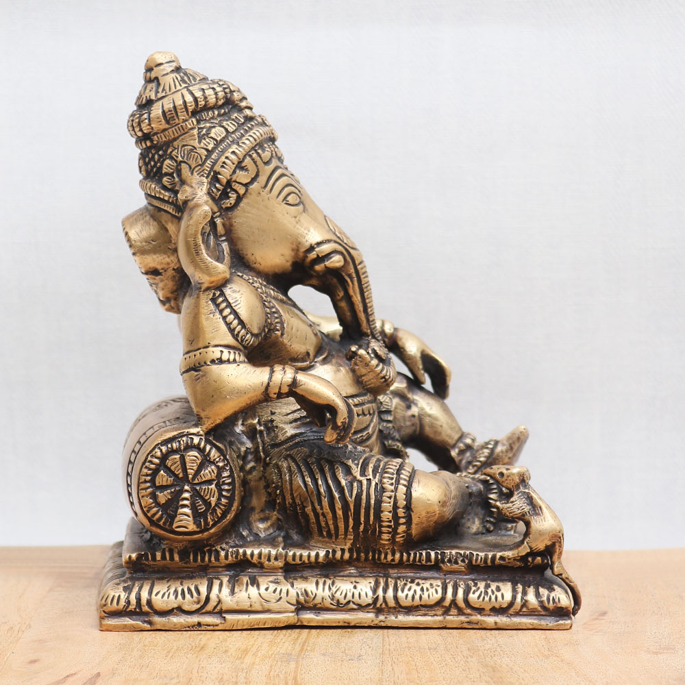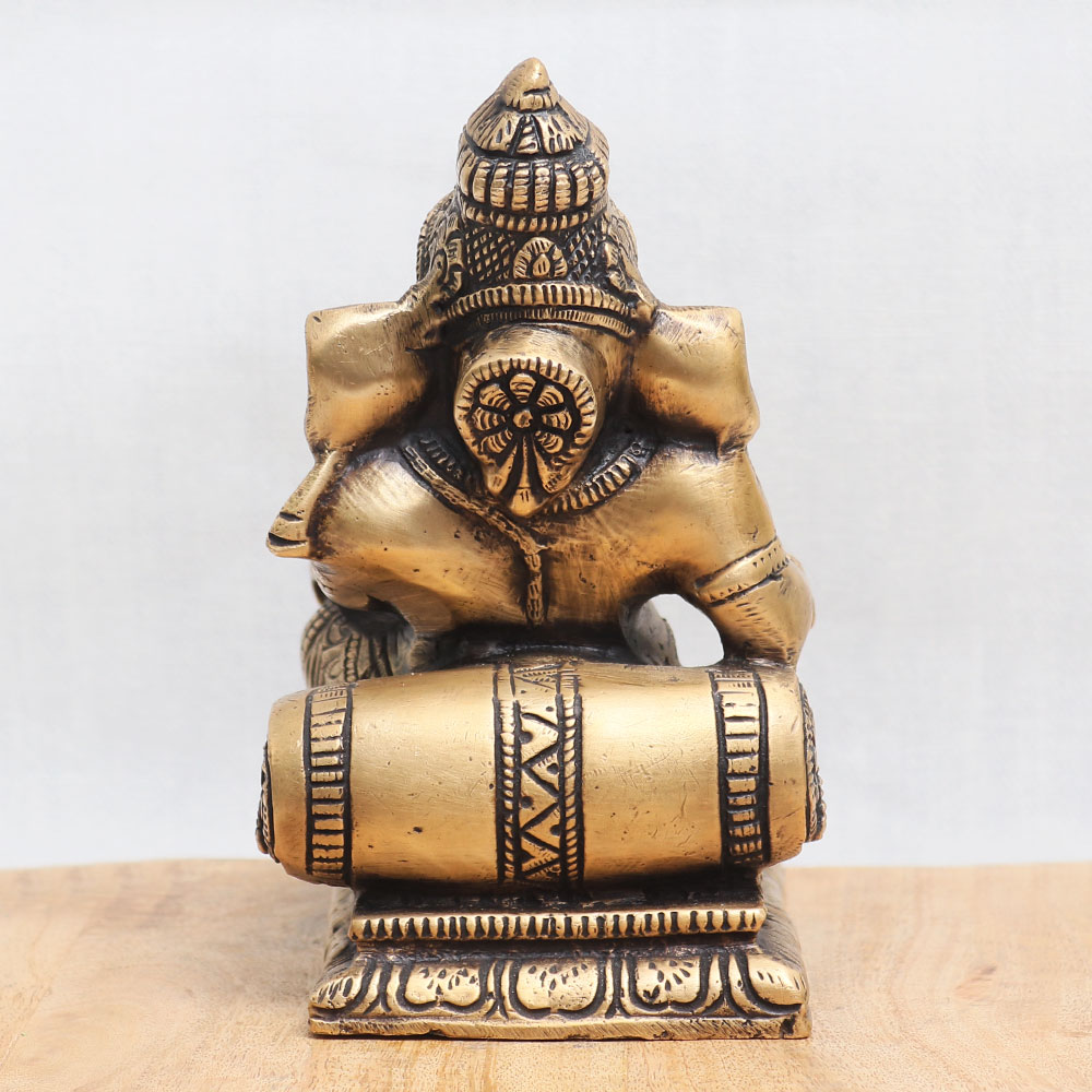 Buy a Lord Ganesha murti online which depicts Lord Ganesha sitting gracefully accompanied by his loyal vahana, Mushak. This divine sculpture is meticulously crafted from high-quality bronze by highly skilled Indian artisans, ensuring exceptional craftsmanship and attention to detail. The handmade creation showcases intricate carvings and embellishments, exuding an antique finish that adds a touch of elegance and charm. Ideal for various settings, this enchanting statue can be proudly placed in your home, office, restaurant, or hotel temple, serving as a focal point for worship. It seamlessly blends spirituality and artistry, making it a captivating addition to any space. Additionally, this remarkable collectible is perfect for vintage enthusiasts and can be proudly displayed in a museum or exhibition. Apart from its symbolic significance, this statue also doubles as a striking decorative piece, instantly enhancing the ambiance with its divine aura. Moreover, it makes for an auspicious gift for your loved ones during special occasions or festivals, symbolizing blessings, prosperity, and good fortune. To experience the divine presence of Lord Ganesha and explore an extensive collection of such exquisite sculptures, browse our website and buy sculptures online in India.