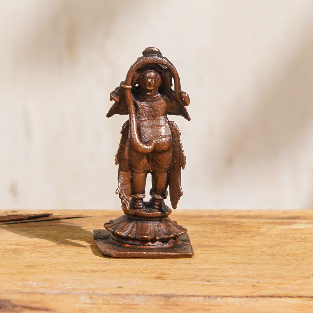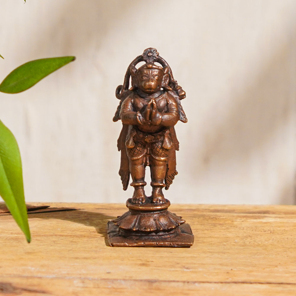 This exquisite copper statue of Lord Hanuman in Namaskar Mudra is a true masterpiece that has been handmade by skilled Indian artisans with intricate details. Lord Hanuman is revered and worshipped in many Indian temples for his strength, devotion, and loyalty. The statue is made of copper, which is considered an auspicious metal in India and is believed to attract positive energy into one's life. Buy this Lord Hanuman Murti online for your temple or prayer room at home, office, restaurant, hotel, cafe or shop. This God sculpture can be gifted to your loved ones on special or festive occasions such as weddings, housewarming ceremonies, and birthdays. It is a perfect gift for someone who loves to collect spiritual items or who is looking for some positive energy in their life. Overall, this copper statue of Lord Hanuman is a beautiful piece of art that will add a touch of spirituality and positivity to any space it is placed in.