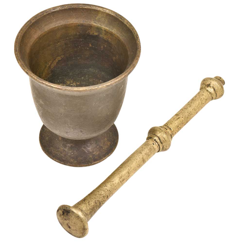 A Heavy Cast Brass Mortar and Pestle Urn shape and Very Nice Old Wear, Especially on the Pestle Used for Grinding Indian Spices That Add Flavor and Aroma to Curries and Other Traditional Dishes. It is Also Used for Medicinal Use Where Herbs are Grinded to Prepare Ayurvedic Medicines.