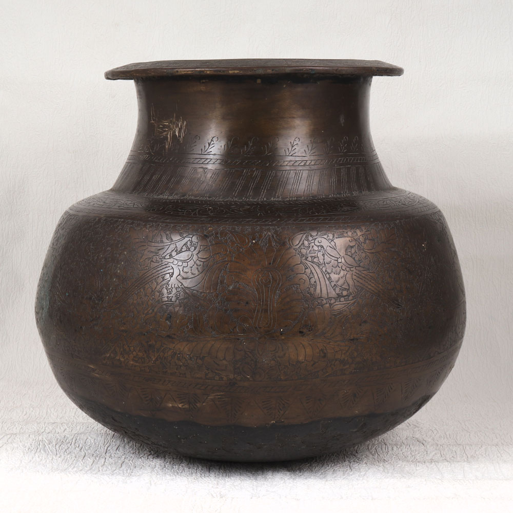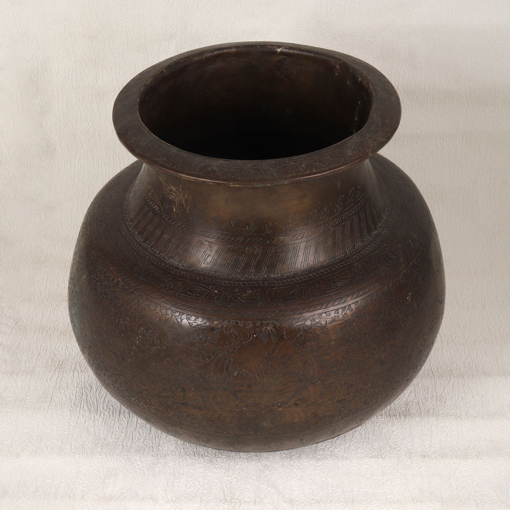 Decorate your living room with our exquisite Vintage Brass Cooking Pot that is a true testament to craftsmanship and heritage. Handmade by professional Indian artisans from Hyderabad, this culinary masterpiece seamlessly blends functionality with timeless aesthetics. Crafted from high-quality brass, the pot features captivating engravings that tell a story of traditional artistry. The antique brown finish adds a touch of old-world charm, making it a perfect addition to any home, office, restaurant, hotel, or cafe. While its initial purpose was for culinary pursuits, its vintage allure now recommends it for decorative purposes only. This versatile piece serves as a stunning indoor flower pot, effortlessly transforming any space into a haven of elegance. A collector's dream, this vintage brass pot is an ideal addition to your curated vintage collection. Its unique design and impeccable craftsmanship make it a thoughtful and meaningful gift for your loved ones on special, festive, or auspicious occasions.