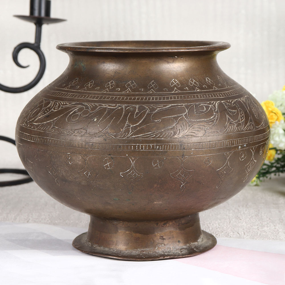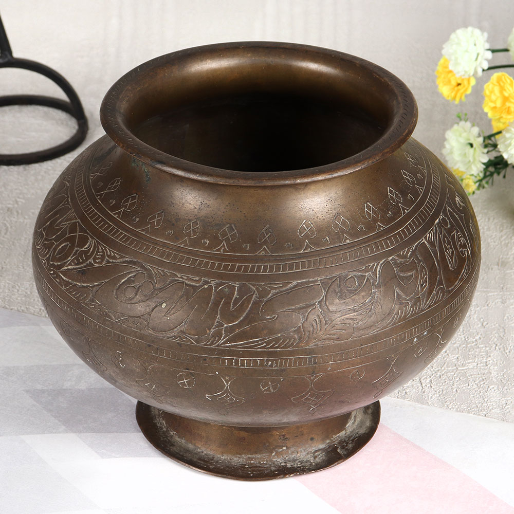 Transform your space with the timeless charm of our Vintage Brass Cooking Pot, artfully converted into a stunning flower pot. This exquisite piece boasts intricate engravings that tell tales of a bygone era, creating a captivating blend of history and nature. Handcrafted by highly skilled and experienced Indian artisans, each pot is a testament to their craftsmanship that is meticulously crafted from high-quality brass. The antique brown finish lends an air of authenticity, making it a striking addition to any environment. Versatile in use, it complements homes, offices, restaurants, hotels, cafes, and shops, instantly elevating the ambiance. Whether gracing your vintage collection or commanding attention at an exhibition, this pot is a conversation starter. Looking for a thoughtful gift? Our vintage brass flower pot is a perfect choice for your loved ones on special, festive, or auspicious occasions. Its enduring beauty and cultural significance make it a cherished present that symbolizes both tradition and the beauty of nature.