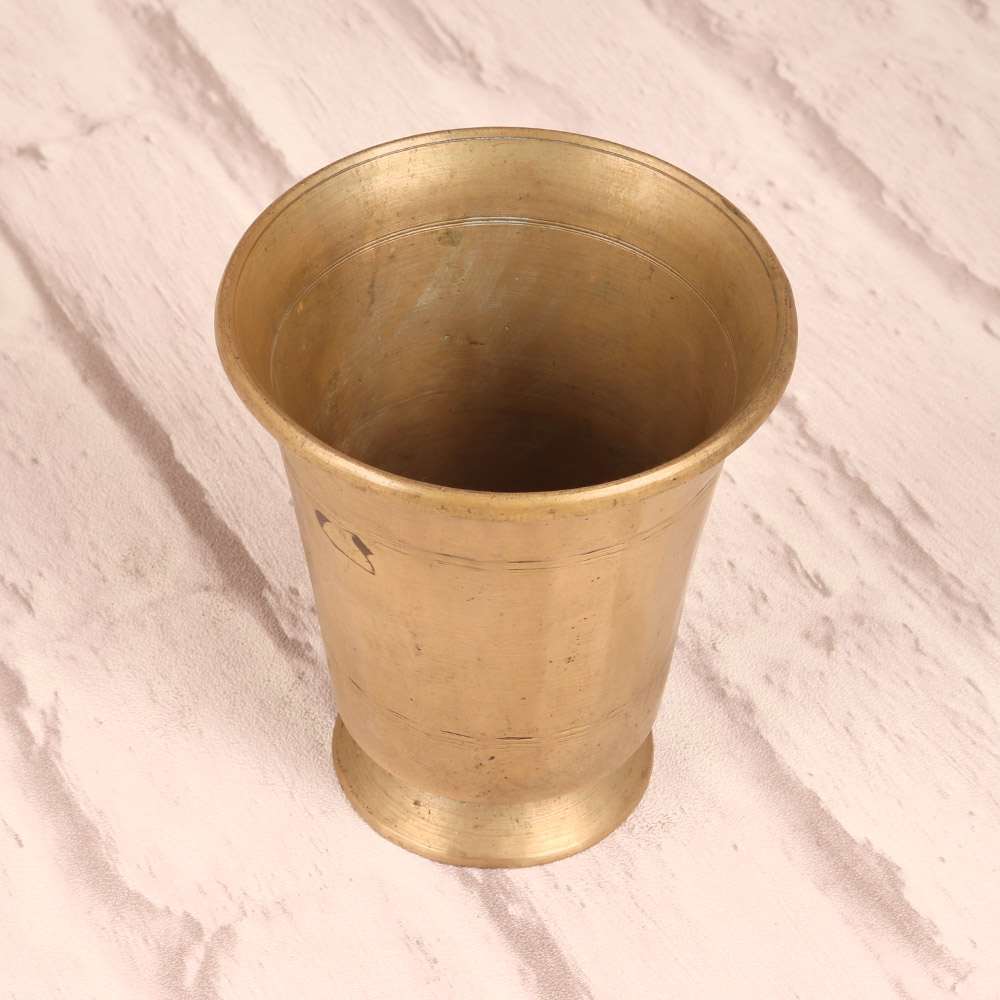 This vintage brass holy water cup is a stunning piece that will transport you to the heart of ancient South Indian spirituality. Crafted with meticulous attention to detail, its classic design and premium materials make it a timeless addition to your ritual tools or home decor. Whether you're looking to elevate your daily puja, seeking a beautiful vessel for your sacred water, or simply want to infuse your space with a sense of cultural heritage, this holy water cup is the perfect choice. Its generous size allows for convenient, mess-free pouring, while the smooth, rounded edges prevent spills for a seamless ritual experience. The natural patina of the brass gives this cup a one-of-a-kind, well-loved appearance, imbuing it with a sense of history and tradition. Display it proudly on your altar, use it to bless your home, or incorporate it into your meditation practice - this versatile piece will quickly become an indispensable part of your spiritual journey.