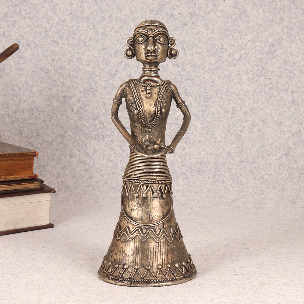 This stunning brass tribal lady statue is a true work of art, blending ancient cultural influences with a modern, sophisticated aesthetic. Crafted with exceptional attention to detail, every inch of this piece is adorned with mesmerizing tribal-inspired patterns and designs that instantly command attention. Whether displayed on a shelf, table, or mantel, this brass statue will elevate the style and ambiance of any space. The solid brass construction ensures exceptional durability, while the unique tribal motifs lend an exotic, worldly vibe that's perfect for infusing your home with global flair. This tribal goddess statue makes a captivating centerpiece or accent piece, elevating your décor while also serving as a stunning conversation starter. Invite the beauty and spirit of ancient tribal art into your living space, and transform any room into a warm, welcoming oasis infused with cultural richness.