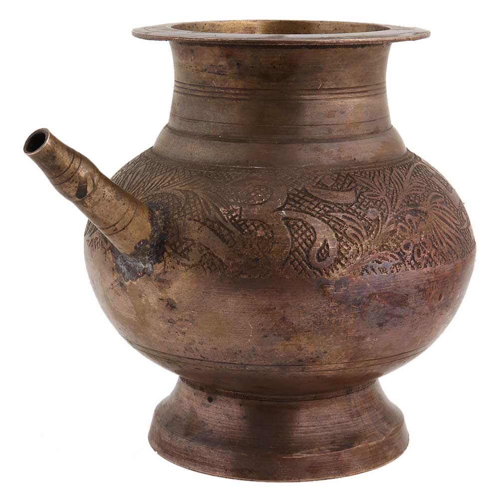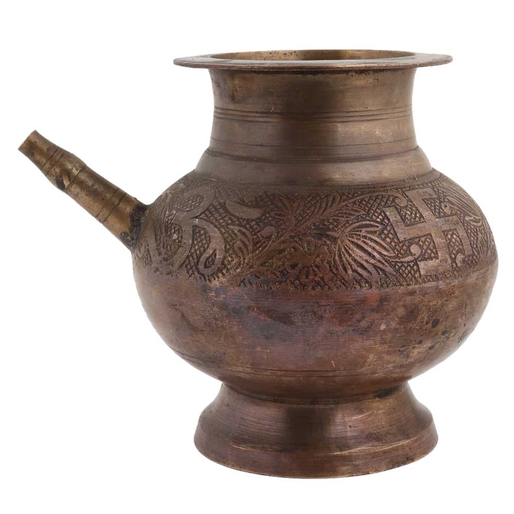 This indian spouted floral brass pot or lota has intricately carved floral ,swastika and aum symbol engraved on the pot used for worship in temples or other religious places, wedding gift, temple decoration, stage decoration, anniversary gift, souvenir and showpiece . Gift for your near and dear ones.