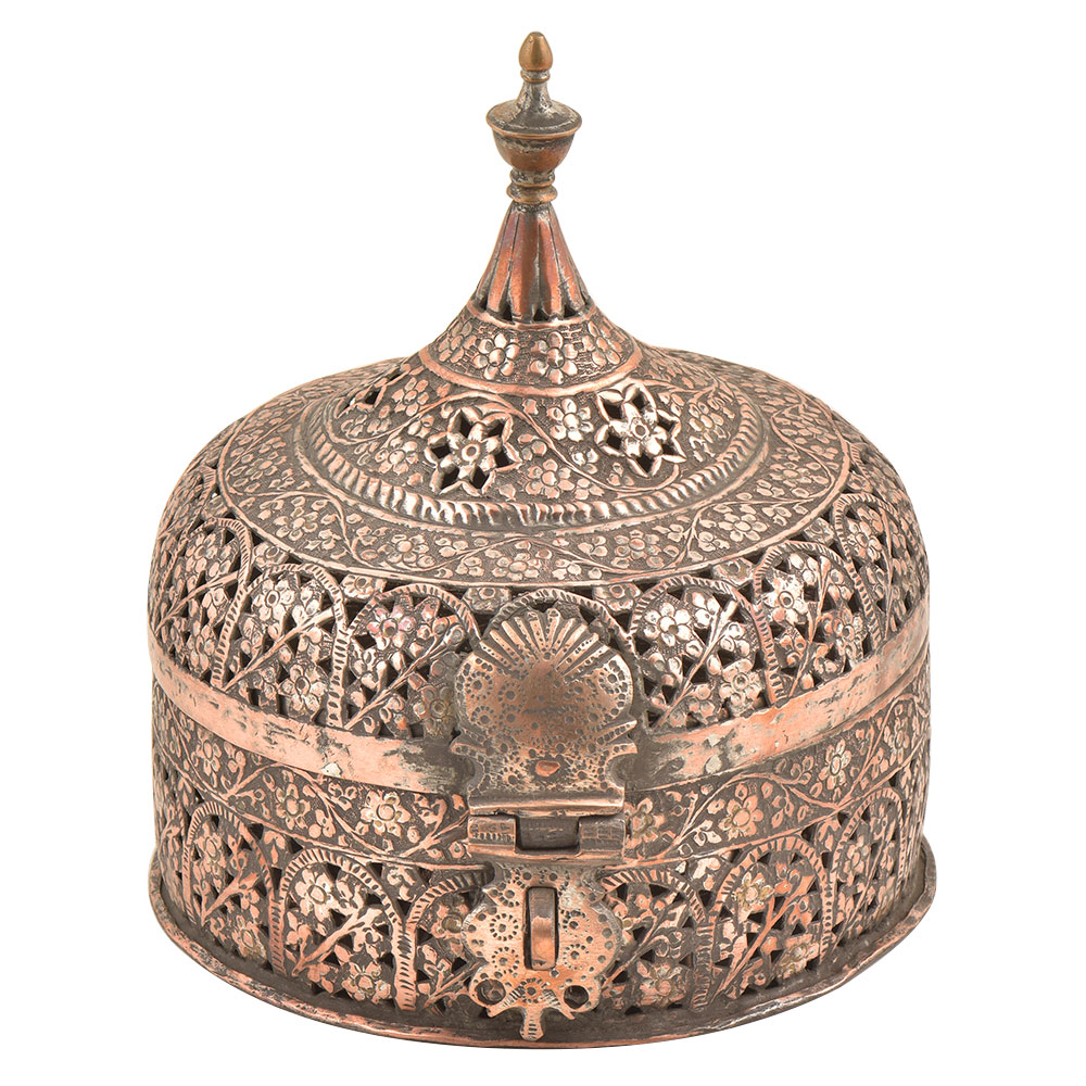 • Indian Stupa Form Embossed Design Copper Paandaan Or Betal Nut Box With Lock Handle