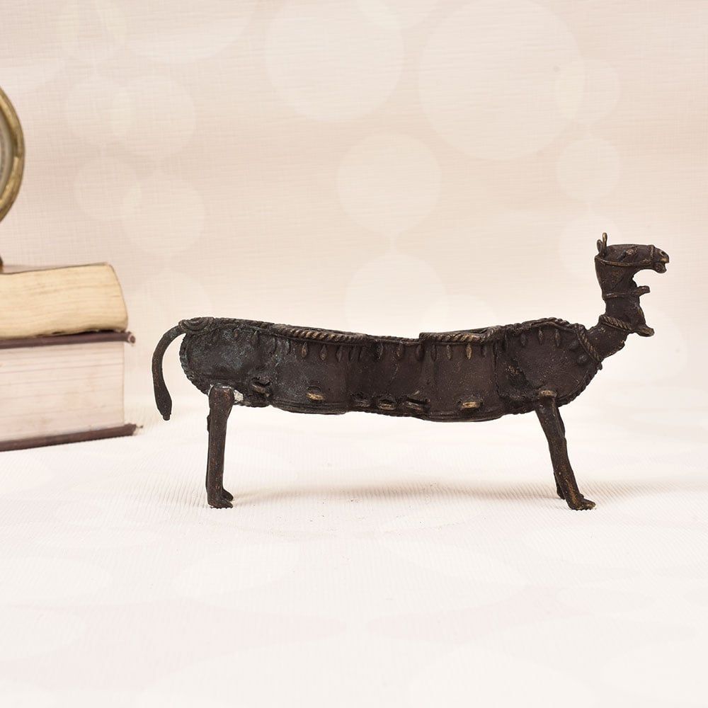 This breathtaking brass camel statue captures the timeless beauty and enduring spirit of the desert. Meticulously crafted using the centuries-old Dhokra technique, each piece is a one-of-a-kind work of art that tells a story of tradition and craftsmanship. The camel's elegant form is rendered in rich, gleaming brass, with an intricate, hammered texture that catches the light and adds depth and dimension. Two small compartments in the body provide hidden storage space for your most precious keepsakes, transforming this stunning statue into a functional and versatile home accent. Whether displayed on a bookshelf, side table, or mantel, this brass camel will transport you to the sweeping sands and vast horizons of the desert. Its majestic presence will infuse any space with a sense of adventure, wonder, and exotic allure. Bring the beauty of the East into your home and let this remarkable piece inspire your imagination for years to come.