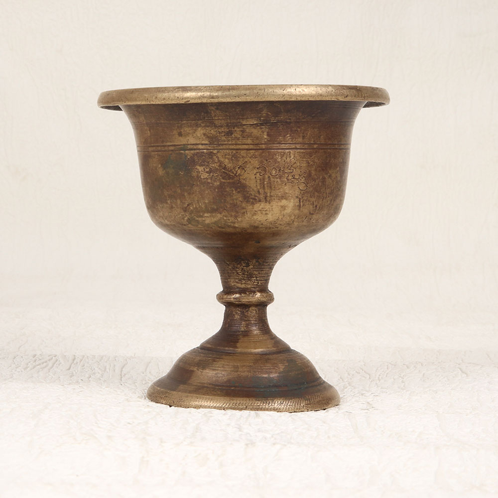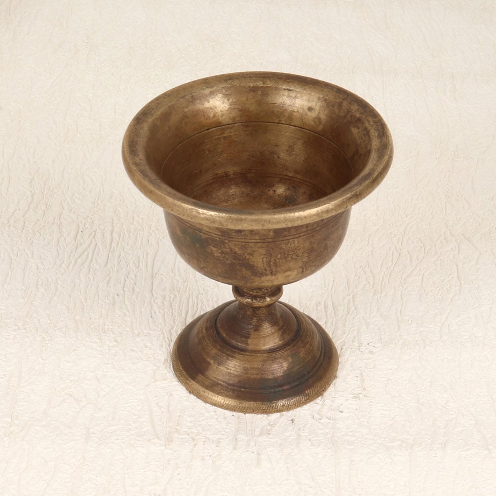 This Vintage Brass Holy Cup is a testament to the rich tradition of prayer and rituals. Handcrafted by professional Indian artisans, this sacred vessel is made from high-quality brass, showcasing a masterful antique brown finish that exudes both authenticity and charm. The cup serves as a sanctified receptacle during prayers, rituals, and havans, holding kumkum tilak with reverence. Its versatile design allows it to seamlessly adorn the prayer rooms of homes, offices, restaurants, hotels, and cafes, bringing an aura of sacred serenity to any space. Beyond its spiritual significance, the Vintage Brass Holy Cup doubles as a captivating decorative piece, effortlessly enhancing the ambiance with its antique allure. This exquisite creation is not merely a functional item but a treasured addition to any vintage collection, encapsulating the cultural richness of its origin. For those seeking a thoughtful and meaningful gift, this holy cup is a perfect choice. Whether celebrating special occasions, festivals, or auspicious moments, presenting this handcrafted masterpiece to loved ones adds a touch of spirituality and tradition to the gesture.