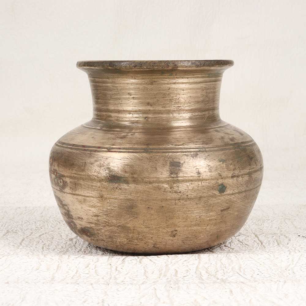 Add an antique charm to your home decor with this stunning vintage brass pot from Gujarat. The elegantly hammered design and timeworn patina give this pot a one-of-a-kind character that immediately catches the eye. This vintage brass pot is perfect for displaying your favorite blooms or simply using as an eye-catching decorative piece. The brass construction is built to last for years while developing an even more unique patina over time. Place it on your patio, entryway table, or bookshelf to add a touch of antique beauty. If you love statement pieces with old-world charm, this vintage brass pot is an elegant way to incorporate antique styling into your home. The gorgeous patina and artisanal craftsmanship make this pot a special find for collectors and design enthusiasts alike. Give your home an instant dose of vintage character with this one-of-a-kind brass pot.