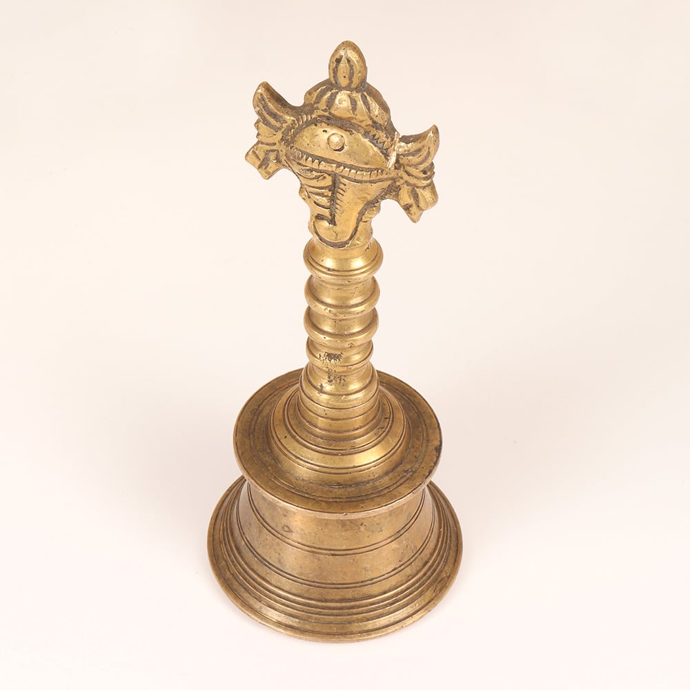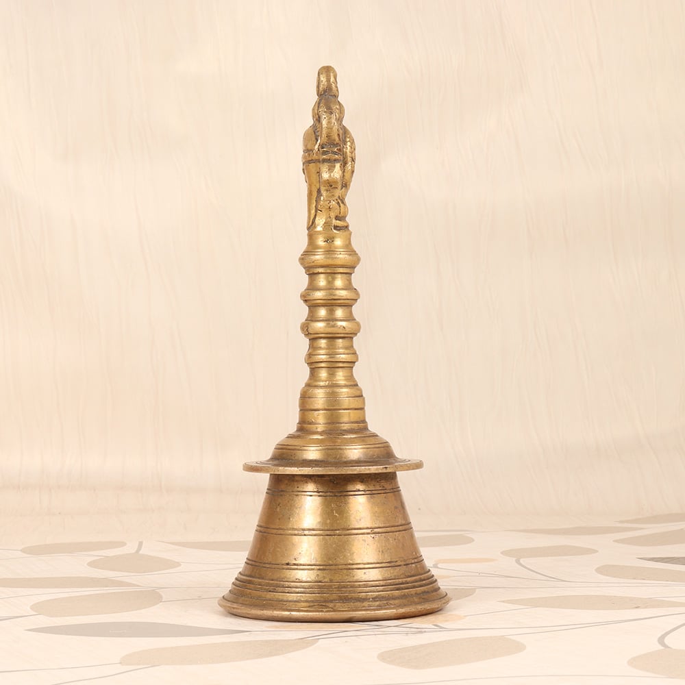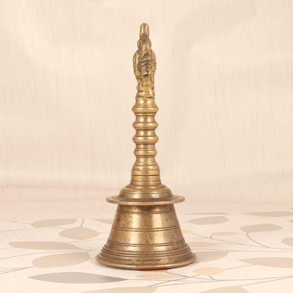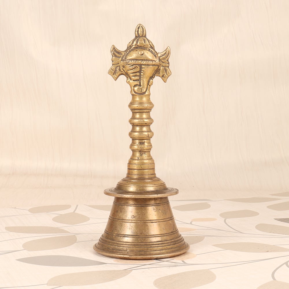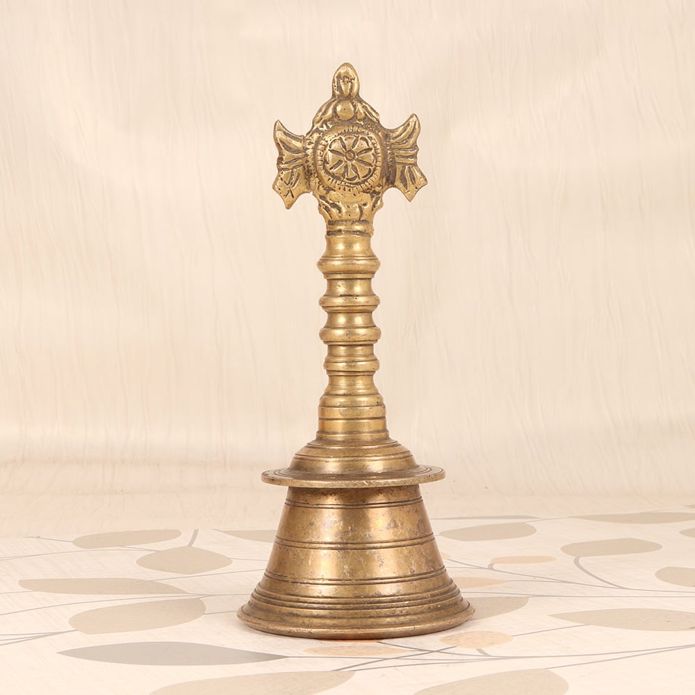 This exquisite vintage brass temple bell is a masterpiece of traditional Indian craftsmanship. Meticulously handmade, it showcases the iconic Lord Vishnu Chakra - a symbol of the divine, universal energy that permeates all of existence. When struck, the bell emits a captivating, resonant tone that instantly soothes the senses and focuses the mind, making it an invaluable tool for meditation, yoga, and spiritual practice. Crafted from durable brass, this temple bell is built to last, with a sturdy handle that allows you to easily ring it during your rituals and ceremonies. At 6 inches in diameter, it's the perfect size to display proudly in your home, office, or meditation space, serving as a beautiful reminder to pause, breathe, and reconnect with the present moment. Whether you're an experienced yogi, a devout spiritual seeker, or simply someone in search of a little more peace and tranquility in your daily life, this vintage brass temple bell will transport you to a state of profound inner harmony. Let its enchanting resonance be the soundtrack to your mindfulness journey.