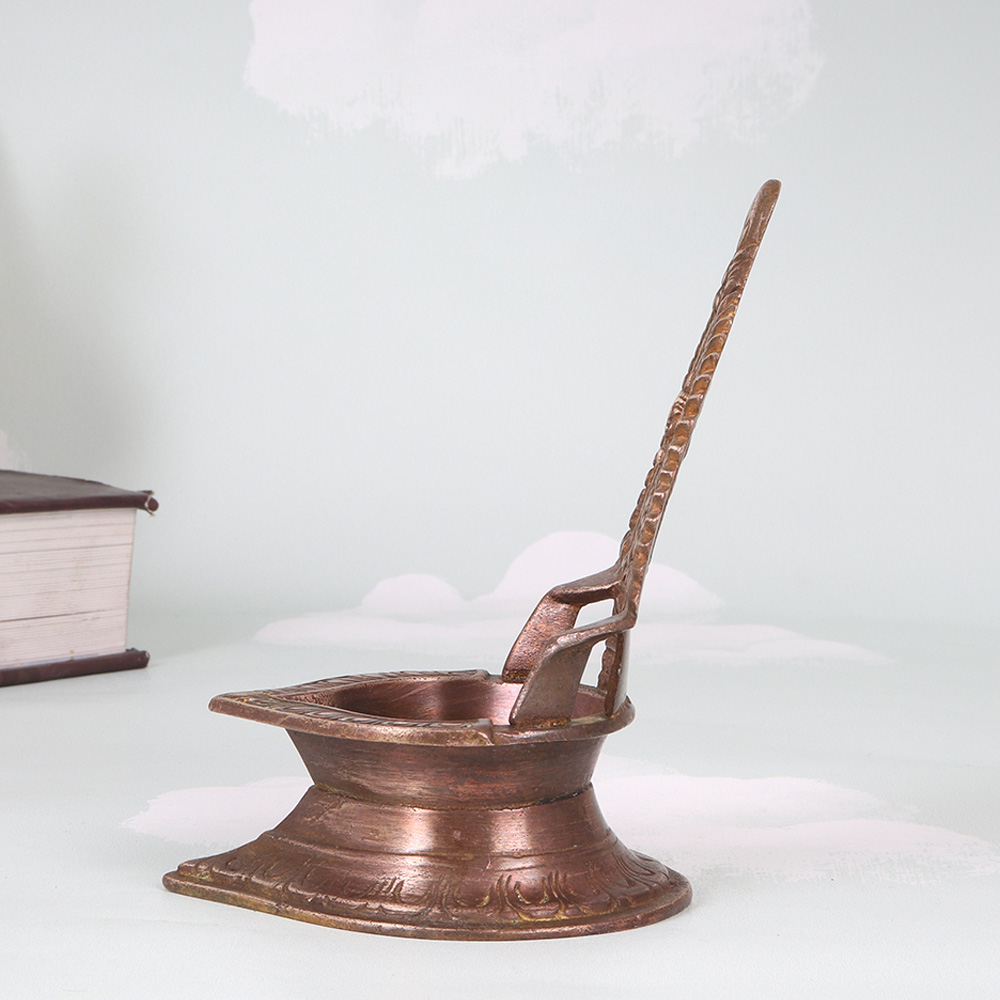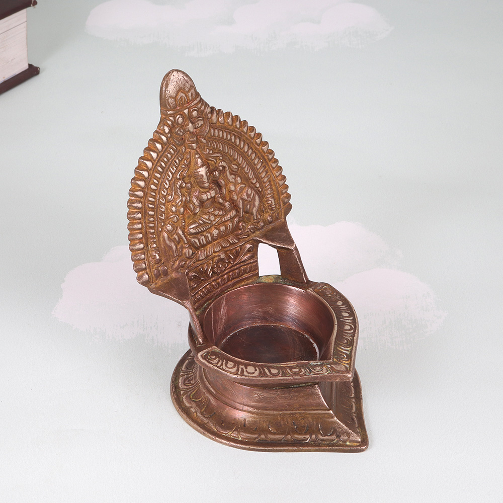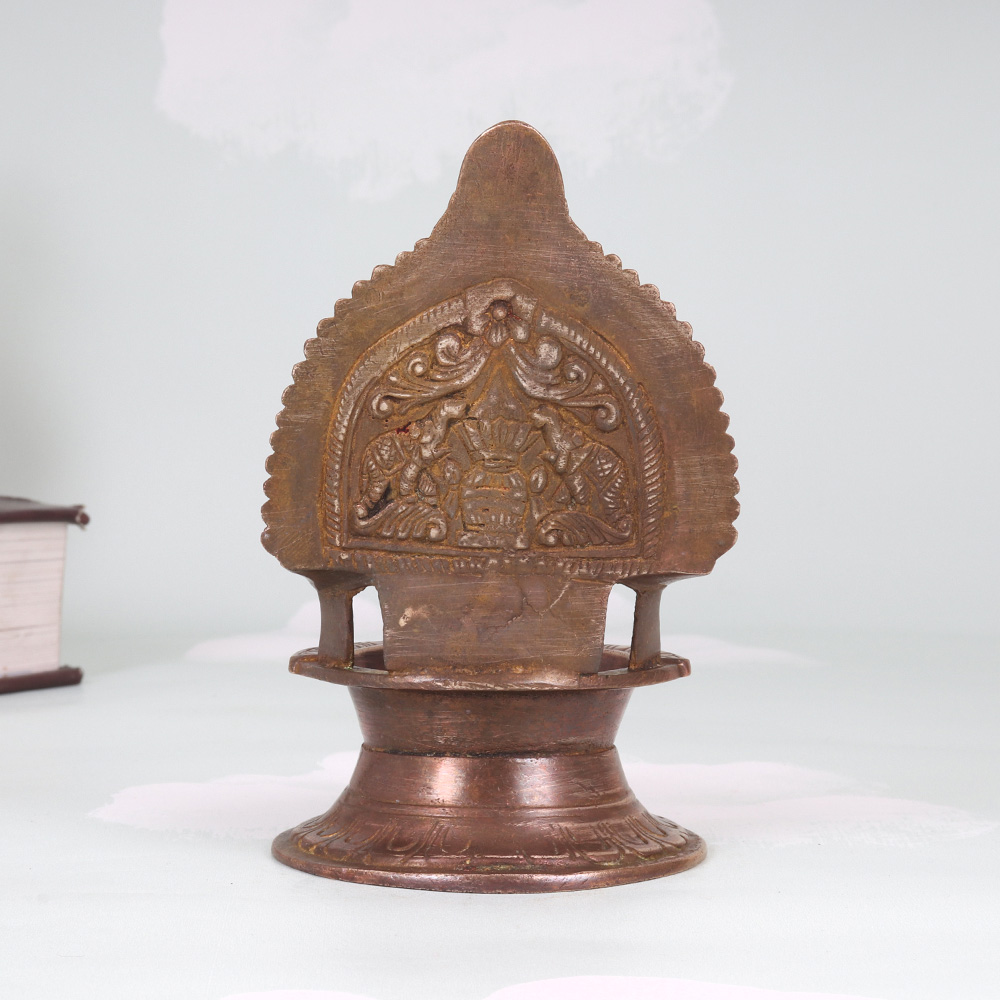 Infuse your sacred space with the mesmerizing glow of this vintage brass Gaja Lakshmi oil lamp. Meticulously crafted by skilled artisans, this stunning piece captures the essence of South Indian spirituality through its stunning Gaja Lakshmi motif. The elegant brass construction radiates a warm, inviting ambiance, perfect for meditation, prayer, or simply adding a touch of timeless elegance to your home. Whether you're seeking to deepen your spiritual practice or simply elevate your living space, this oil lamp is a must-have. Its sturdy base ensures stability, allowing you to enjoy the captivating flame for hours on end. Embrace the rich cultural heritage of South India and let the Gaja Lakshmi oil lamp become a cherished centerpiece in your sacred sanctuary.