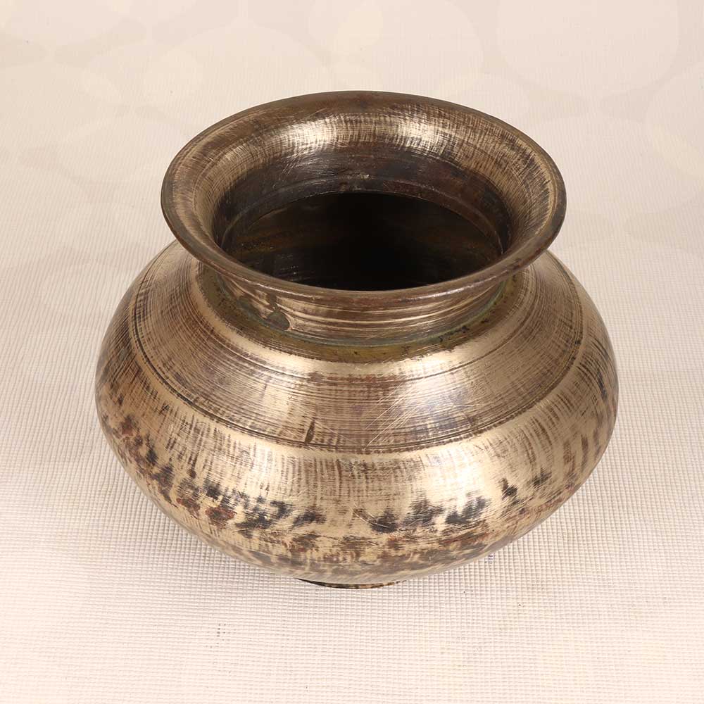 Bring spiritual tranquility into your home with this brass holy water pot. Expertly handcrafted in India, this pot features gorgeous vintage brasswork with traditional South Indian art motifs. The plain brown finish gives it an antique, sacred vibe - ideal for storing holy water used in rituals and prayer. Place this pot on your home altar or puja room to uplift your space with its sacred energy. Use it to dip your fingers and bless yourself before prayers. Or fill it with flowers for a lovely decorative accent. With its versatile design, this brass pot is sure to add serenity and beauty wherever it's displayed. If you seek a special vessel to honor your faith, this holy water pot is for you. Its vintage look provides an authentic, meaningful way to incorporate spiritual rituals into your home.