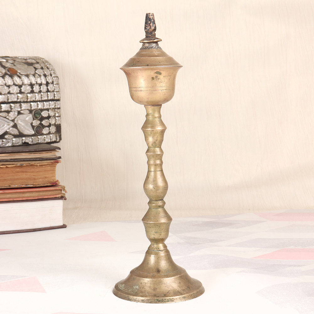 Illuminate your space with the timeless glow of a vintage brass oil lamp. This stunning piece from Central India is more than just a source of light - it's a work of art that will transform any room into a cozy, inviting oasis. Imagine coming home to the gentle flicker of this vintage oil lamp, its soft light casting a soothing glow over your living space. More than just a functional light source, this lamp is a stunning centerpiece that will elevate the aesthetic of any room. The intricate brass etching and classic silhouette give it an heirloom-quality feel, transporting you to a bygone era of timeless sophistication. Whether you're looking to create a cozy, intimate atmosphere or simply add a touch of vintage charm to your decor, this brass oil lamp is the perfect choice. Its versatility makes it a thoughtful gift for newlyweds, new homeowners, or anyone who appreciates the beauty of handcrafted, functional art. Bring the warm glow of tradition into your space and enjoy the soothing ambiance of this truly special lamp.