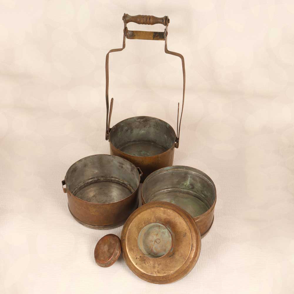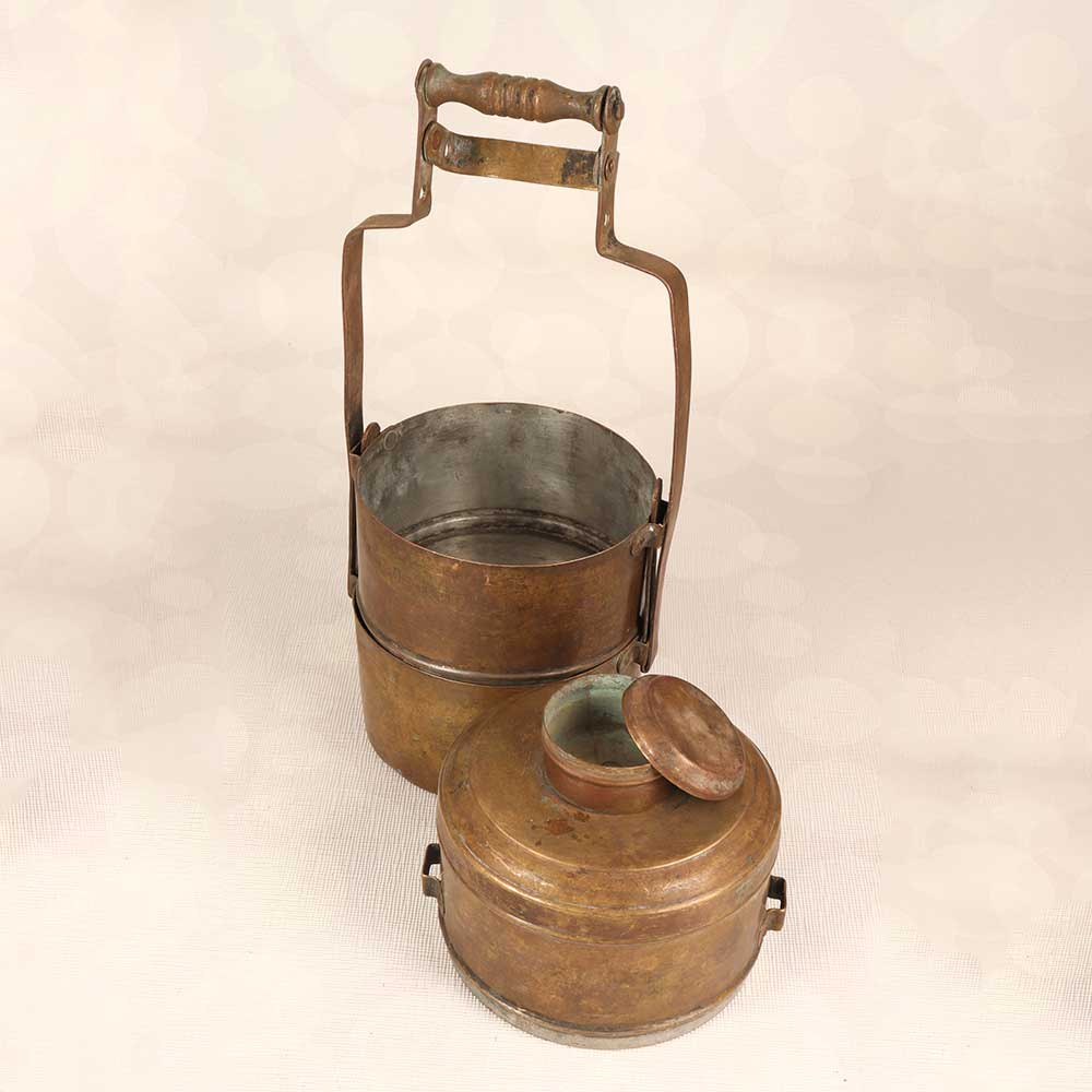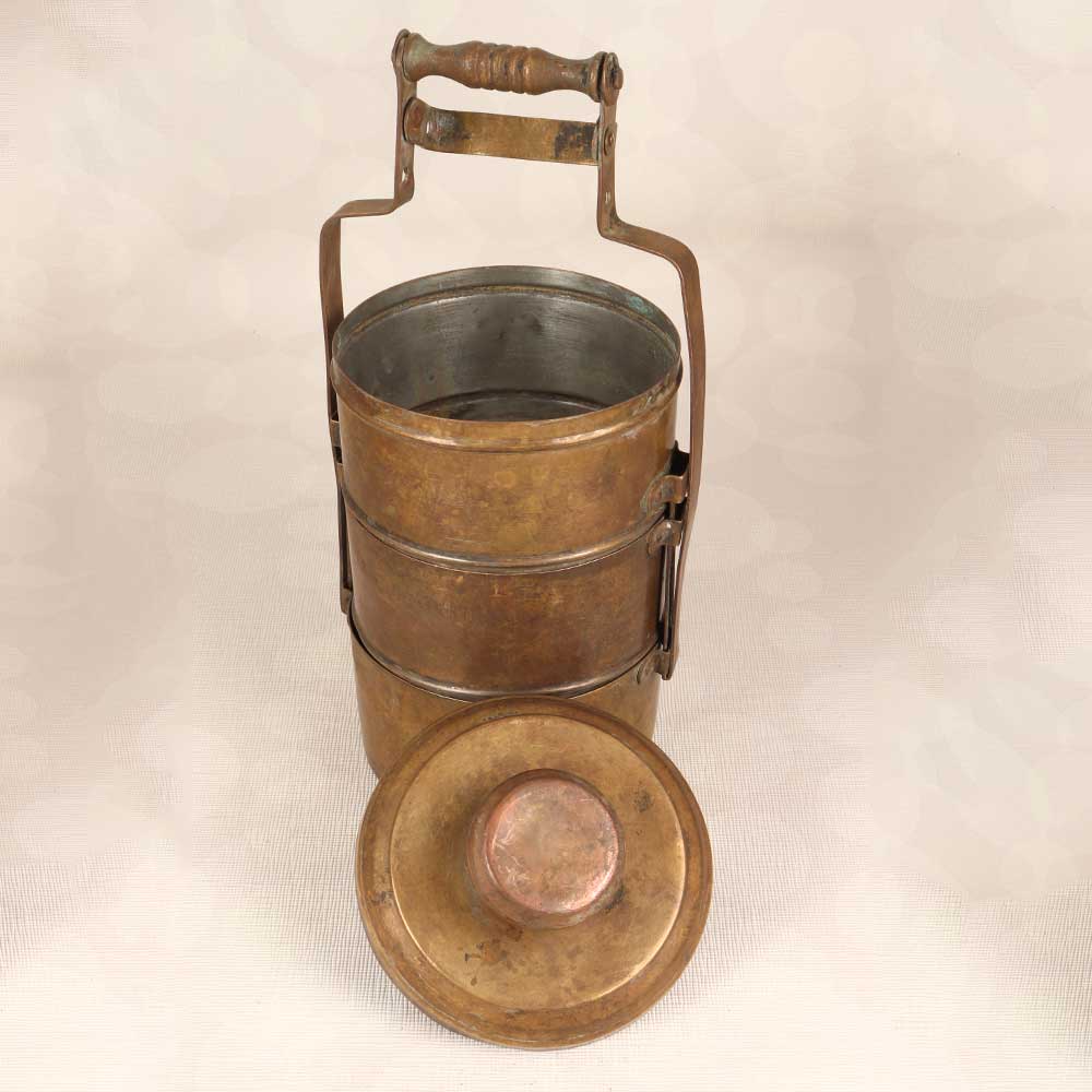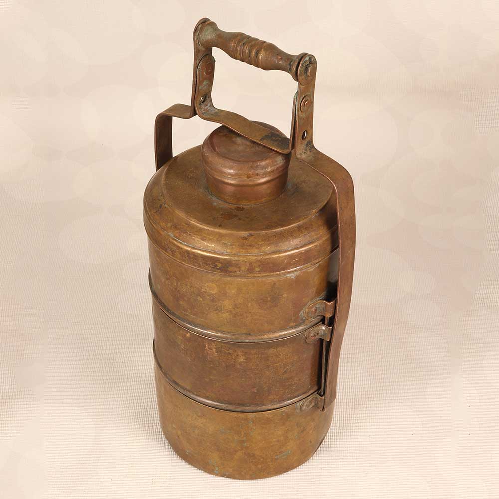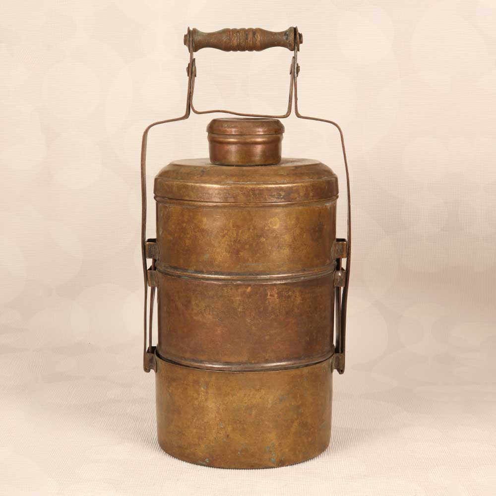 Step into the history and tradition of India with this stunning vintage brass tiffin box. Lovingly crafted decades ago in Northern India, this decorative piece instantly transports you to a bygone era with its intricate engraved patterns and timeworn patina. Perfect as an exotic accent piece, this vintage tiffin box makes a mesmerizing addition to any home decor. Display it on your coffee table or bookshelf to add a pop of old-world charm to your living room. Place it on your kitchen counter filled with faux fruit for a dose of boho chic style. Or showcase it proudly on your entryway console table as a meaningful conversation starter for guests. However, you use it, this vintage brass tiffin box is sure to draw the eye and spark curiosity. With its detailed handiwork and rich history, this brass box is ideal for collectors and decor enthusiasts. Let its legacy spark your imagination and connect you to the traditions of the past. Make this vintage tiffin box from Northern India the next treasured addition to your home.