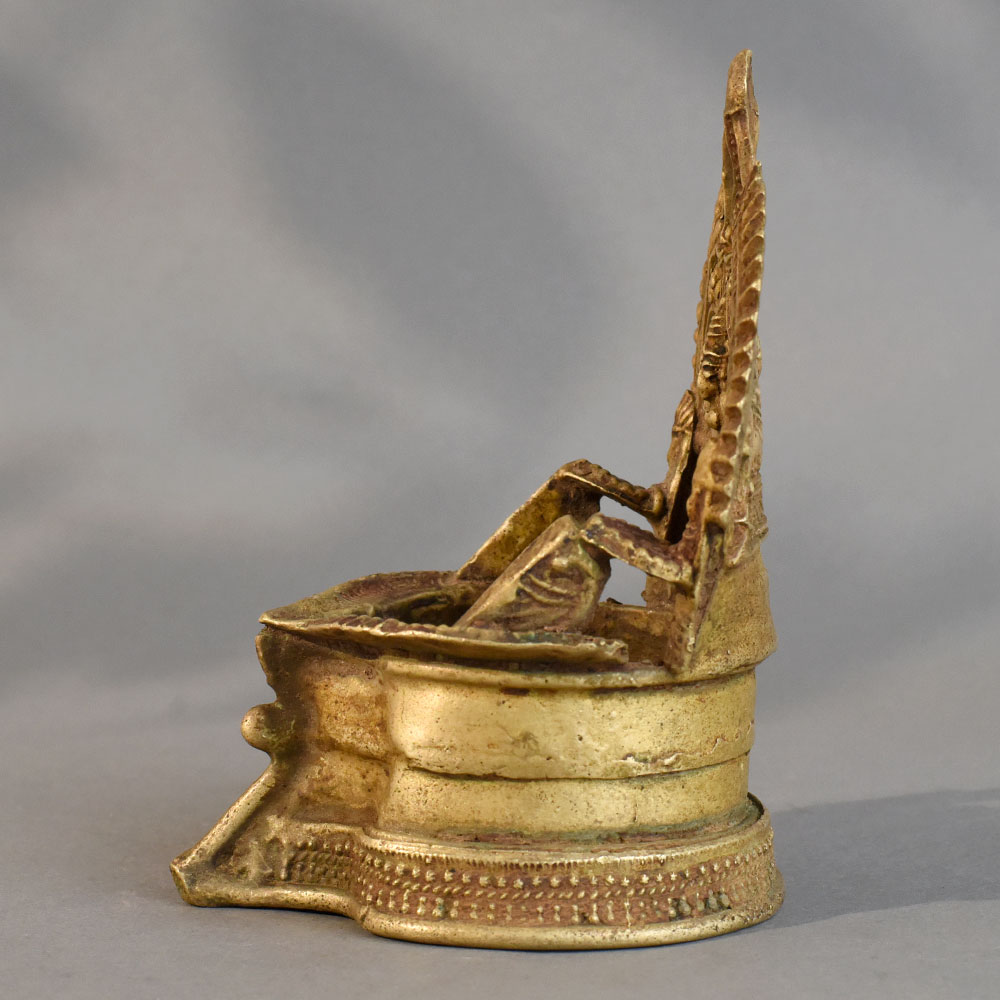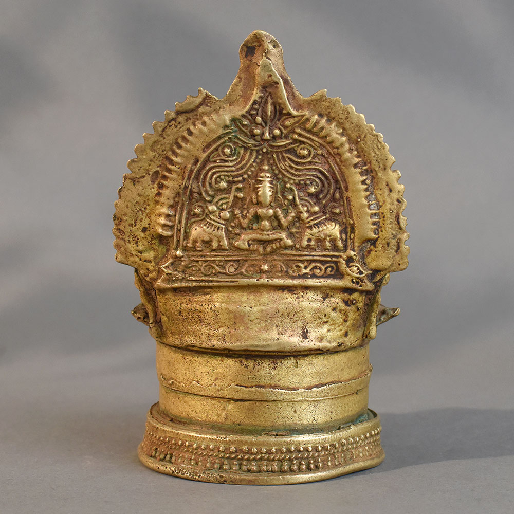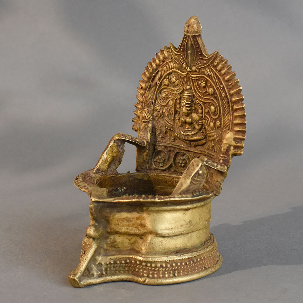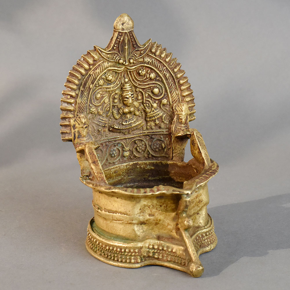 This traditional handmade brass pooja diya is a beautiful representation of South Indian vintage artistry and devotion. The diya features an intricately designed backplate with detailed carvings of divine motifs, enhancing its sacred charm. Crafted from pure brass, it embodies strength and durability while preserving the timeless elegance of temple-style design. Its deep oil-holding section makes it perfect for daily rituals, festive celebrations, or meditation practices. The antique finish further enriches its authentic appearance, making it not only a functional diya but also a unique collectible or decor piece. Ideal for pooja rooms, home temples, and gifting, this diya brings light, positivity, and spiritual grace to any setting.