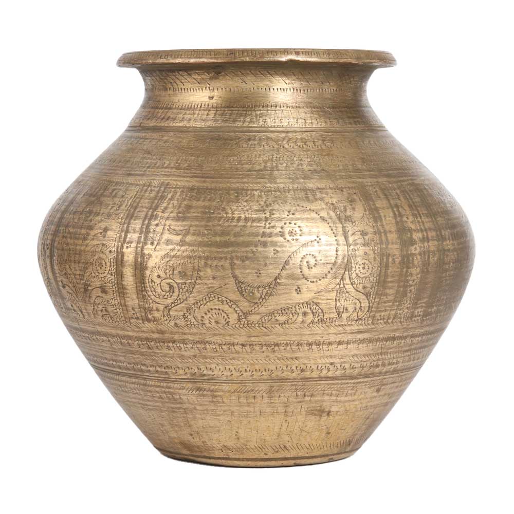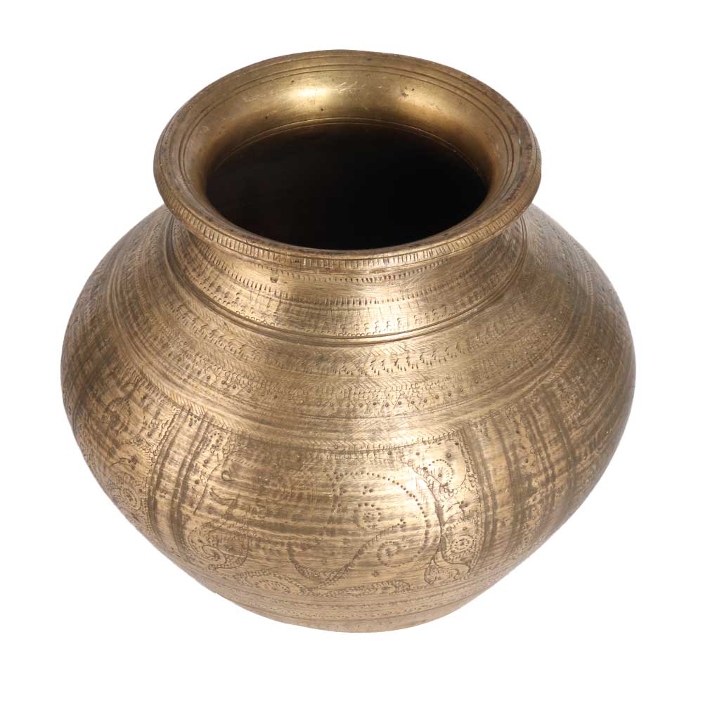 A Traditional Indian lota with engraved motifs and golden finish that makes the vessel eye-catching. Decorate your home, office, restaurant, hotel, cafe, spa or store with a golden water pot. It has a flat bottom that provides a better grip on the surface. Its sturdy look makes it a perfect addition to your collection or restaurant. It is the first choice for vintage art collectors to add to their collection and for decorating experts. Brass lota are used to store sacred water in the house and temple, which spreads the positive energy in the house. Gift this incredible water pot to your loved ones on special, festive or auspicious occasions.