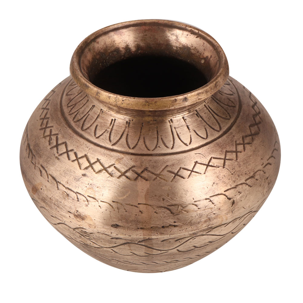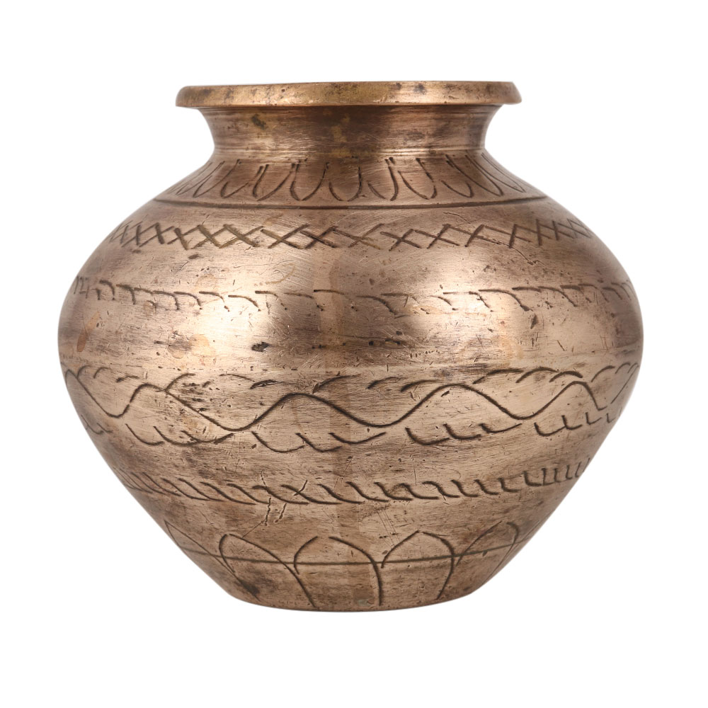A Brass Water Pot or Lota in an elegant brown finish, adorned with intricate engravings, meticulously crafted by highly skilled Indian artisans. This traditional masterpiece is a captivating decorative piece that effortlessly blends cultural heritage with timeless elegance. Since centuries, this Brass Water Pot has held significant importance in Indian households and temples, serving as a vessel to offer water to deities, the sun god, and the revered Shivling. It also finds its purpose in storing sacred water from the holy river Ganga, ensuring the preservation of its divine essence. This revered pot is an indispensable part of Hindu rituals, auspicious ceremonies, and havans. Versatility is a hallmark of this exceptional creation, as it can double as an indoor flower pot, bringing a touch of natural beauty to your living room or patio garden. Moreover, its ornate design and symbolic significance make it a thoughtful and cherished gift for your family, friends, or relatives on special occasions, festivals, or auspicious events.