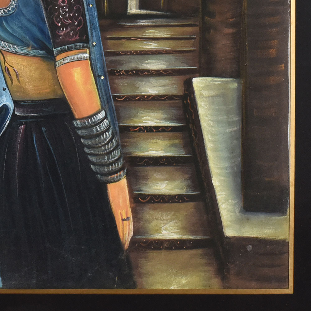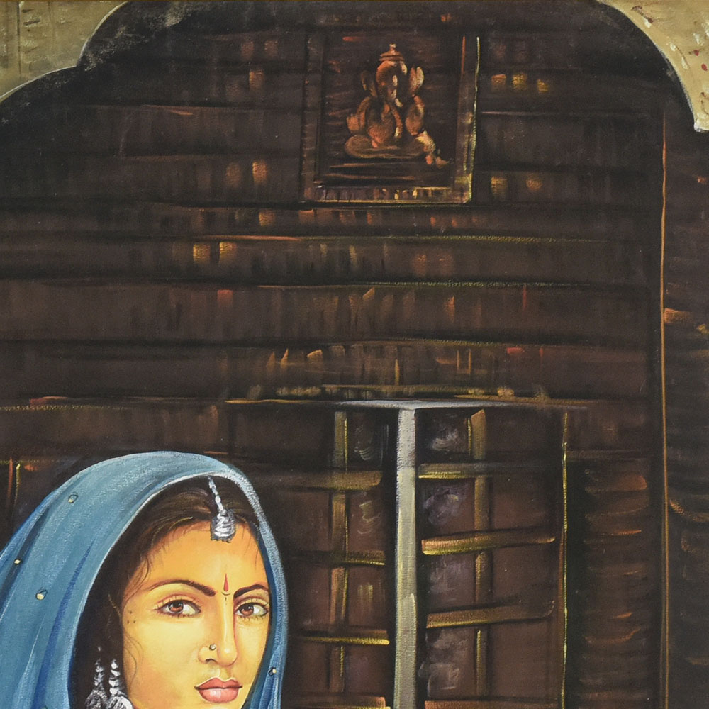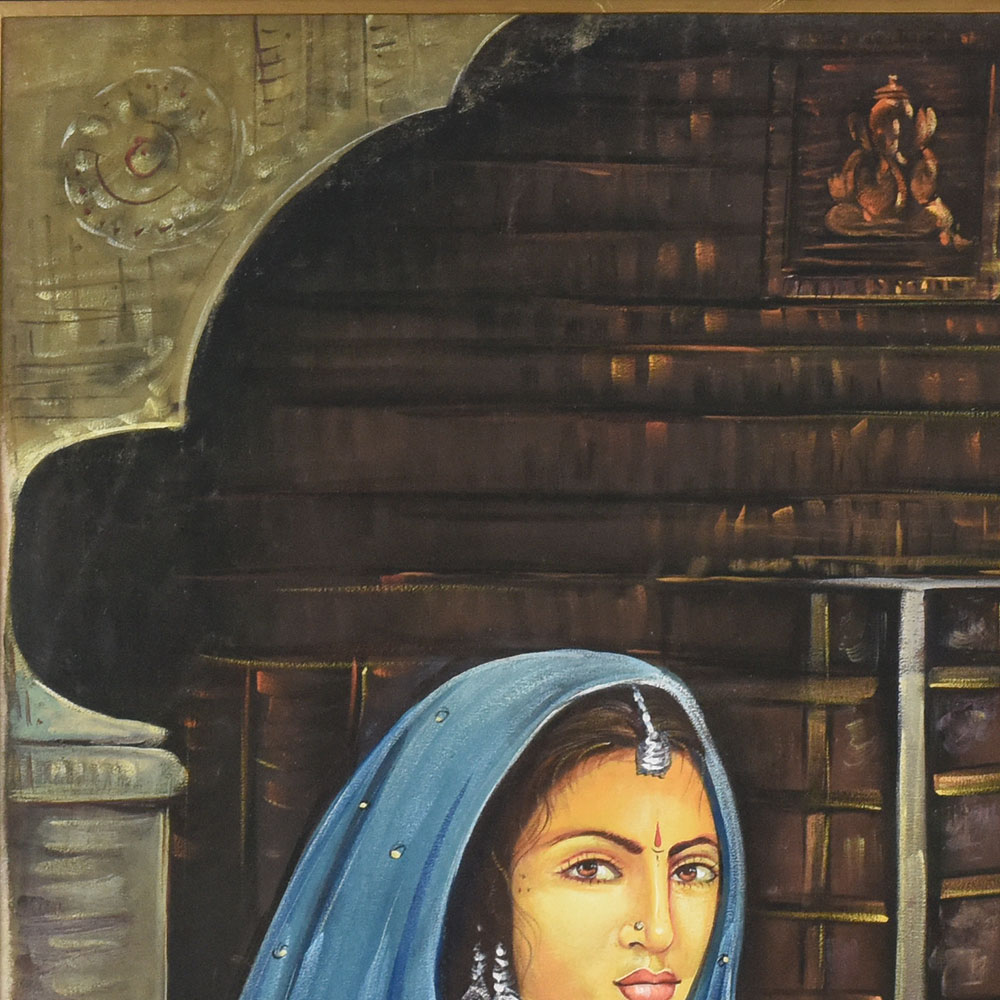 Bring home a masterpiece of heritage with this Indian traditional Rajput vintage painting on cloth, elegantly framed for preservation and display. The artwork portrays a graceful Rajput woman dressed in traditional attire, adorned with jewelry and bangles, her deep gaze capturing the essence of royal elegance and cultural pride. The detailed background of intricately designed architecture highlights the grandeur of Rajput heritage, while the fine brushwork and earthy tones reflect the timeless artistry of Indian traditions. Crafted on cloth with exceptional attention to detail, this vintage piece is a stunning example of traditional hand-painted techniques. The protective frame not only enhances its visual appeal but also ensures durability, making it perfect for collectors, art lovers, or cultural decor enthusiasts. This painting serves as both an artistic treasure and a historical reflection of India’s regal past.