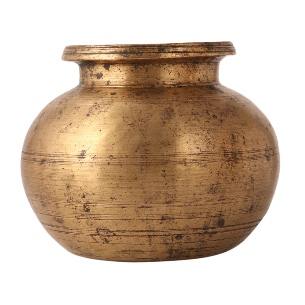The traditional round water pot is made of bronze. It has a large belly with a small mouth. It was used in weddings, temples and other Hindu rituals. You can use it as a decorative piece or as a flower pot to decorate your home and office.